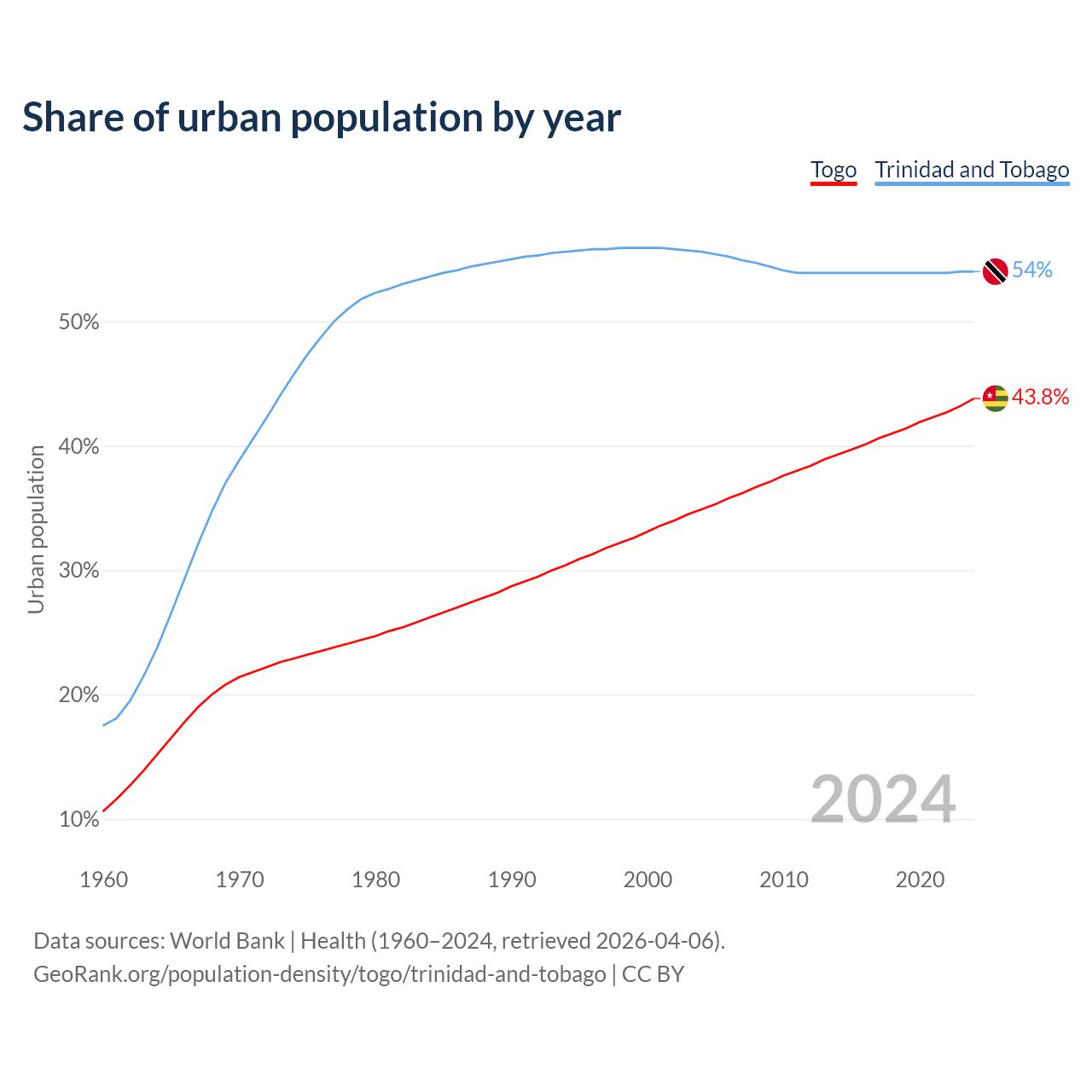 From 2004 to 2024, the share of urban population changed from 34.9% to 43.8% in Togo and from 55.6% to 54% in Trinidad and Tobago.