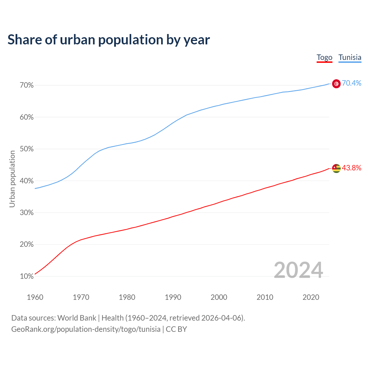 From 2004 to 2024, the share of urban population changed from 34.9% to 43.8% in Togo and from 64.9% to 70.4% in Tunisia.