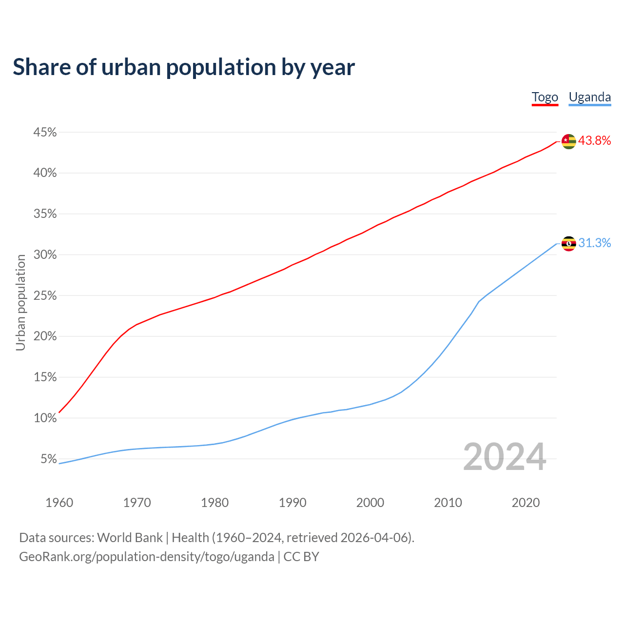 From 2004 to 2024, the share of urban population changed from 34.9% to 43.8% in Togo and from 13.1% to 31.3% in Uganda.