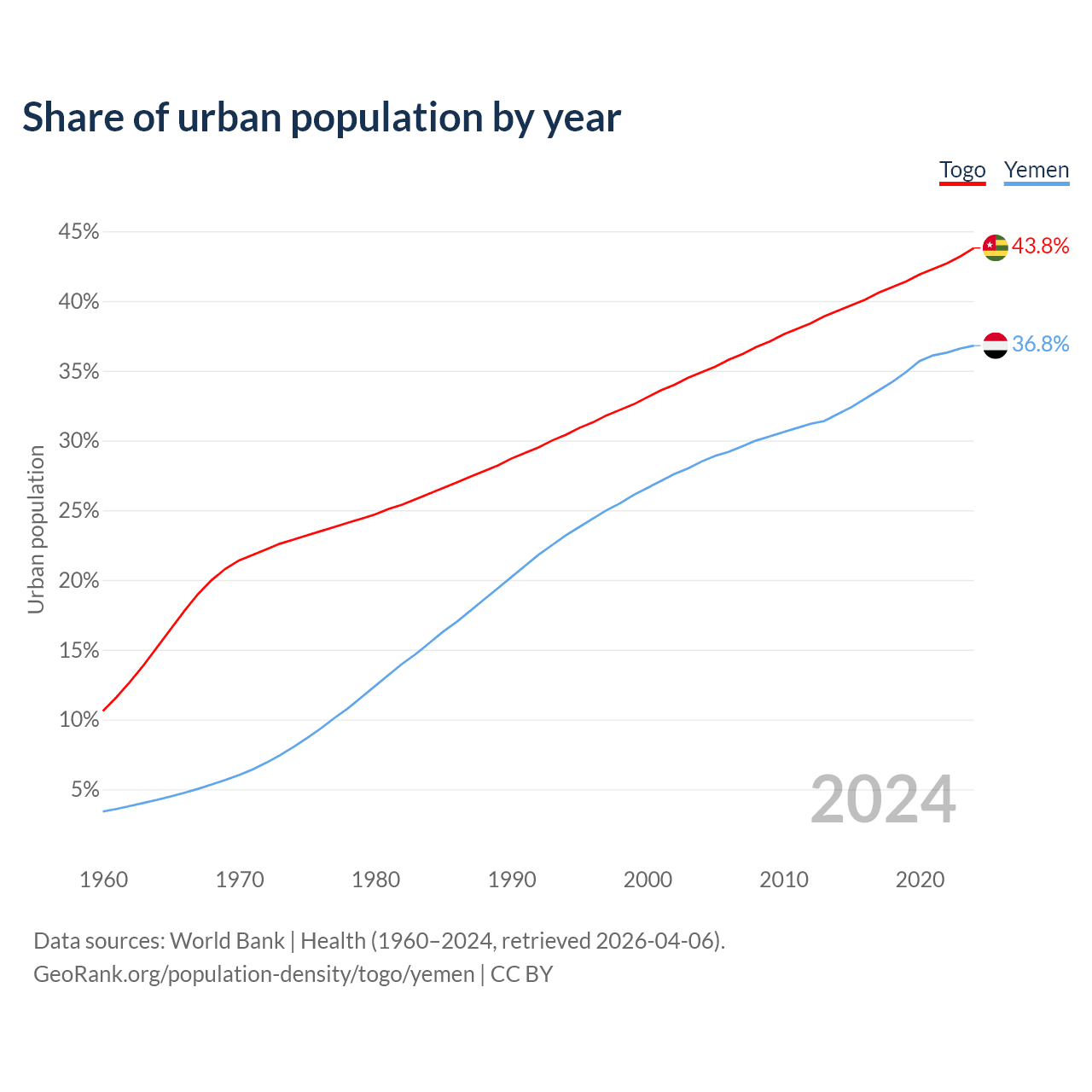 From 2004 to 2024, the share of urban population changed from 34.9% to 43.8% in Togo and from 28.5% to 36.8% in Yemen.