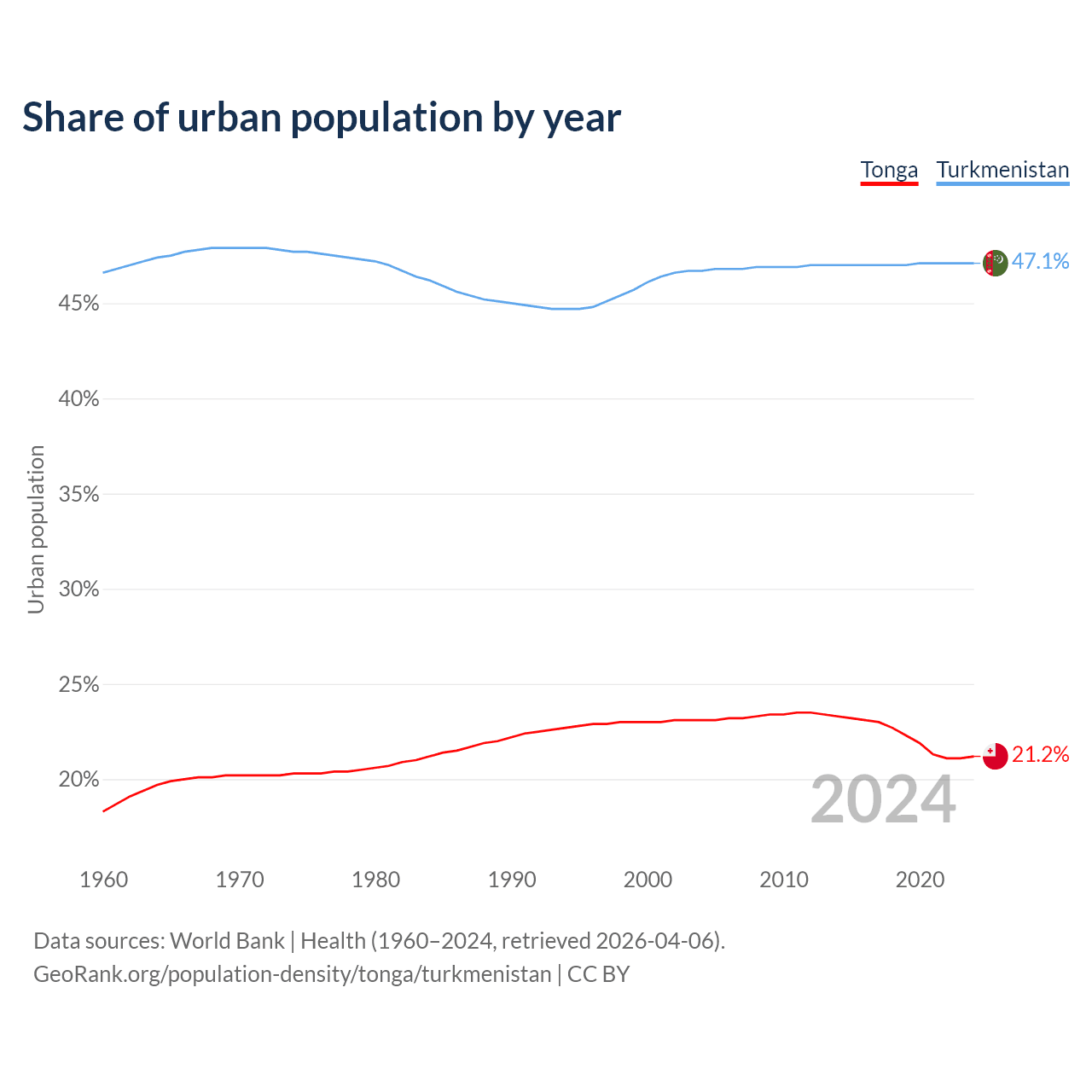 From 2004 to 2024, the share of urban population changed from 23.1% to 21.2% in Tonga and from 46.7% to 47.1% in Turkmenistan.