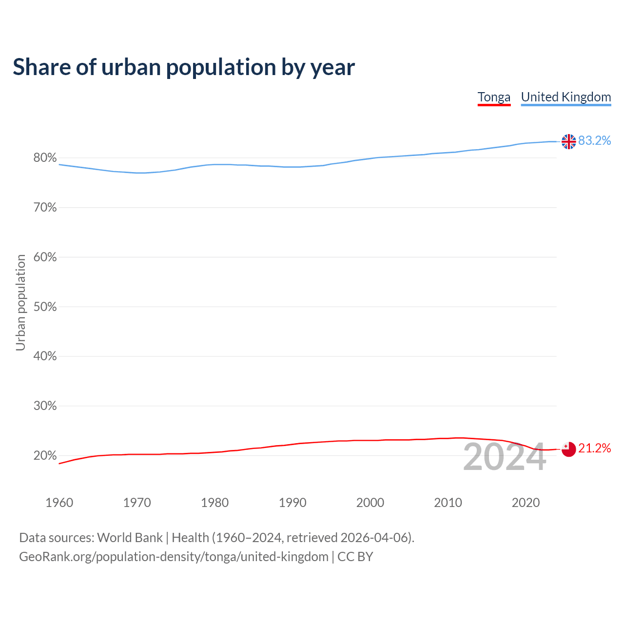 From 2004 to 2024, the share of urban population changed from 23.1% to 21.2% in Tonga and from 80.3% to 83.2% in the United Kingdom.