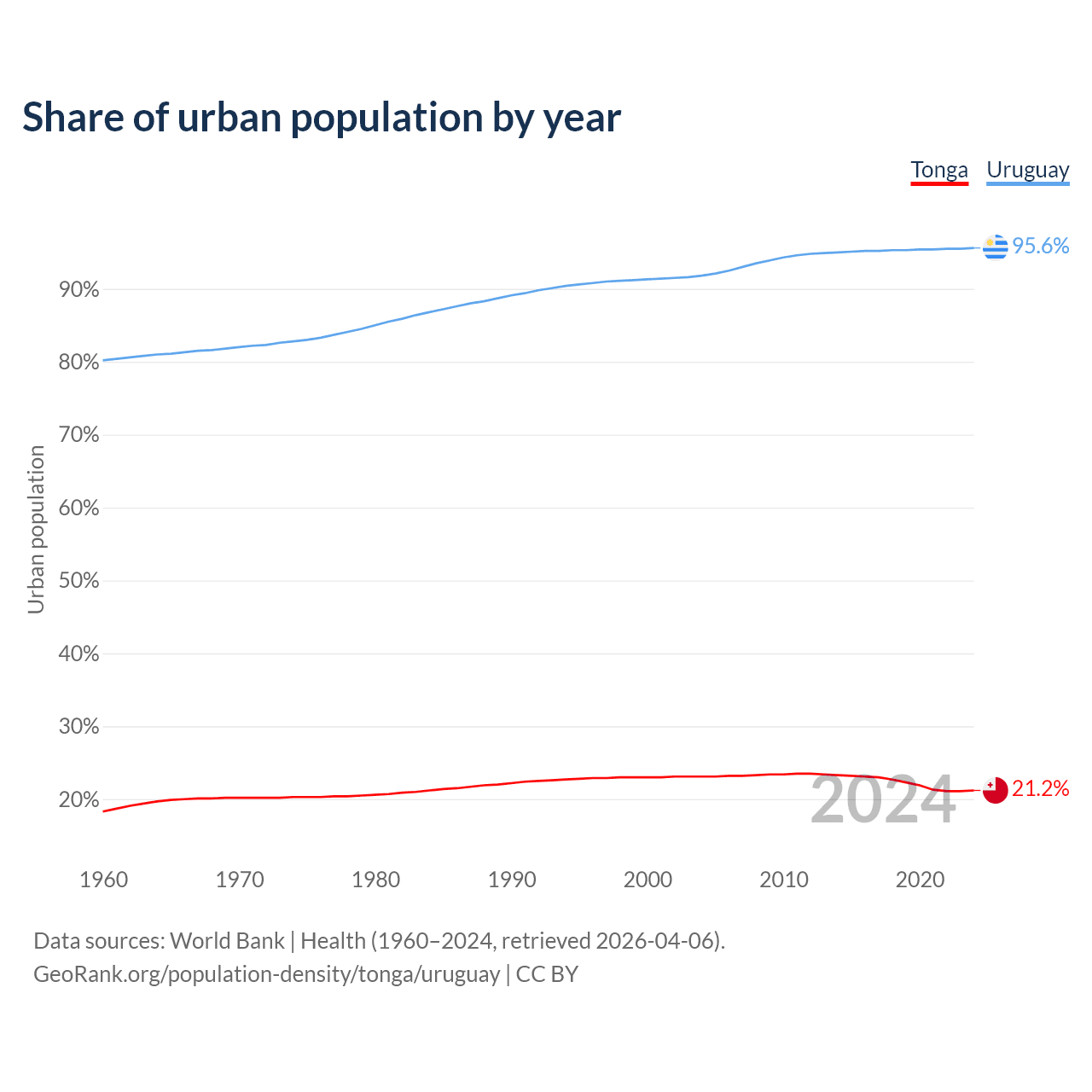 From 2006 to 2026, population density in Tonga decreased by 2.77%, compared to a 2.84% growth in Uruguay.