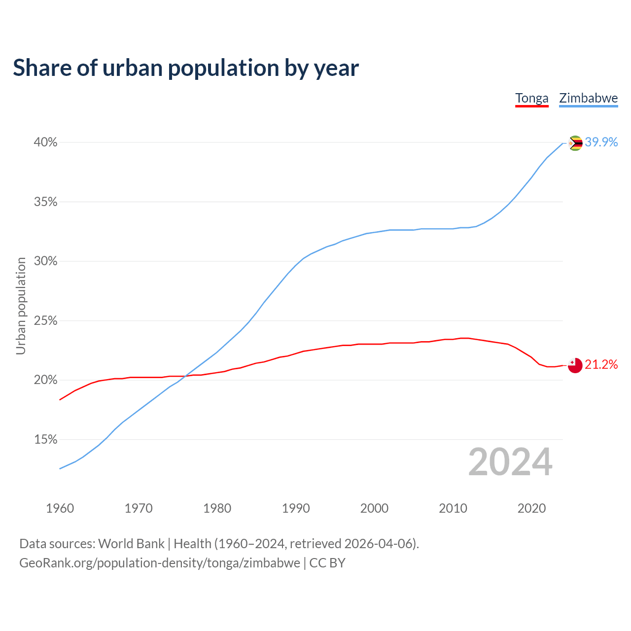 From 2006 to 2026, population density in Tonga decreased by 2.77%, compared to a 36.7% growth in Zimbabwe.