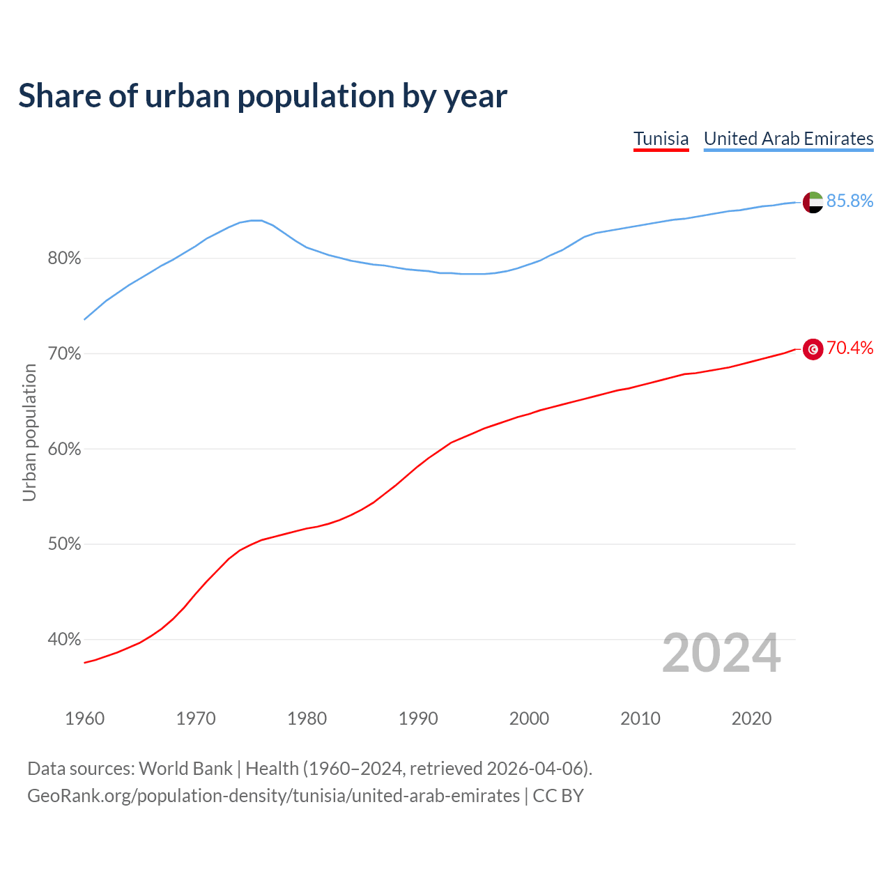 From 2004 to 2024, the share of urban population changed from 64.9% to 70.4% in Tunisia and from 81.5% to 85.8% in the United Arab Emirates.