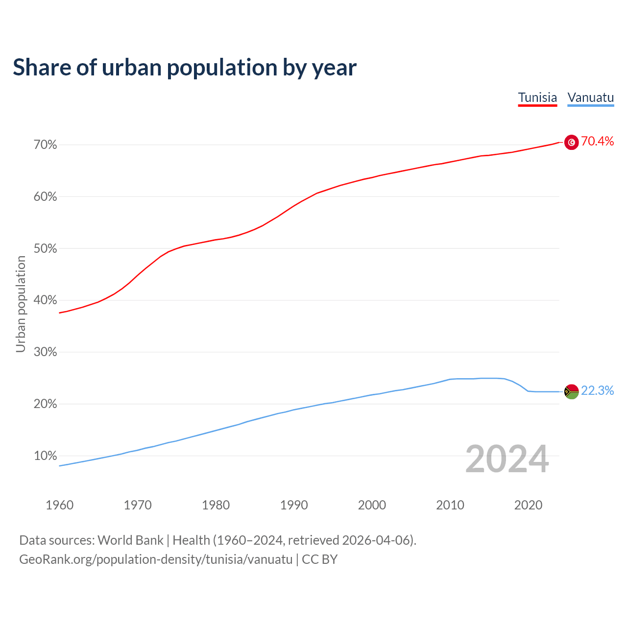 From 2004 to 2024, the share of urban population changed from 64.9% to 70.4% in Tunisia and from 22.7% to 22.3% in Vanuatu.