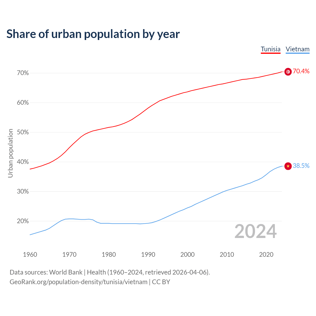 From 2004 to 2024, the share of urban population changed from 64.9% to 70.4% in Tunisia and from 26.8% to 38.5% in Vietnam.