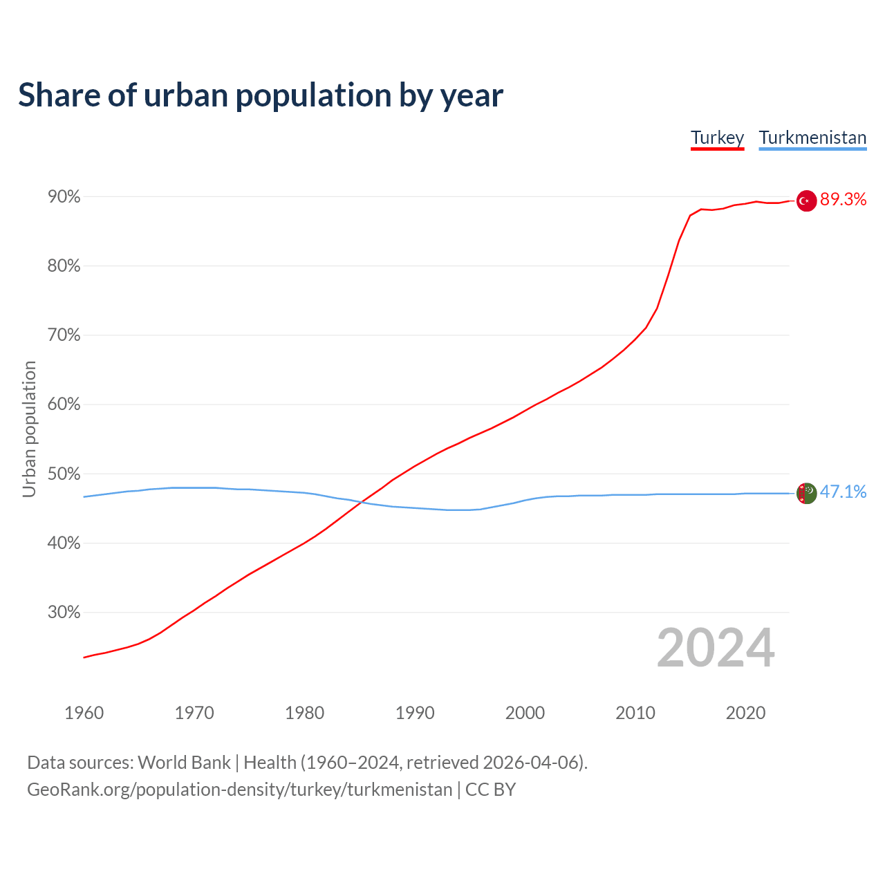 From 2004 to 2024, the share of urban population changed from 62.4% to 89.3% in Turkey and from 46.7% to 47.1% in Turkmenistan.