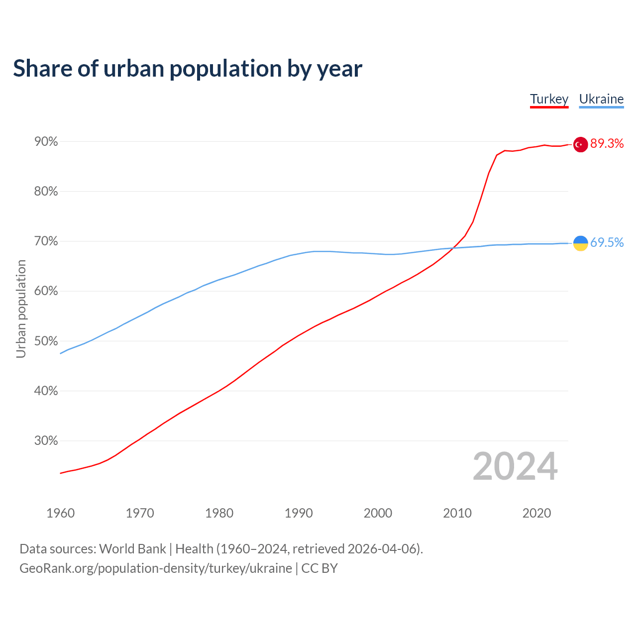From 2004 to 2024, the share of urban population changed from 62.4% to 89.3% in Turkey and from 67.6% to 69.5% in Ukraine.