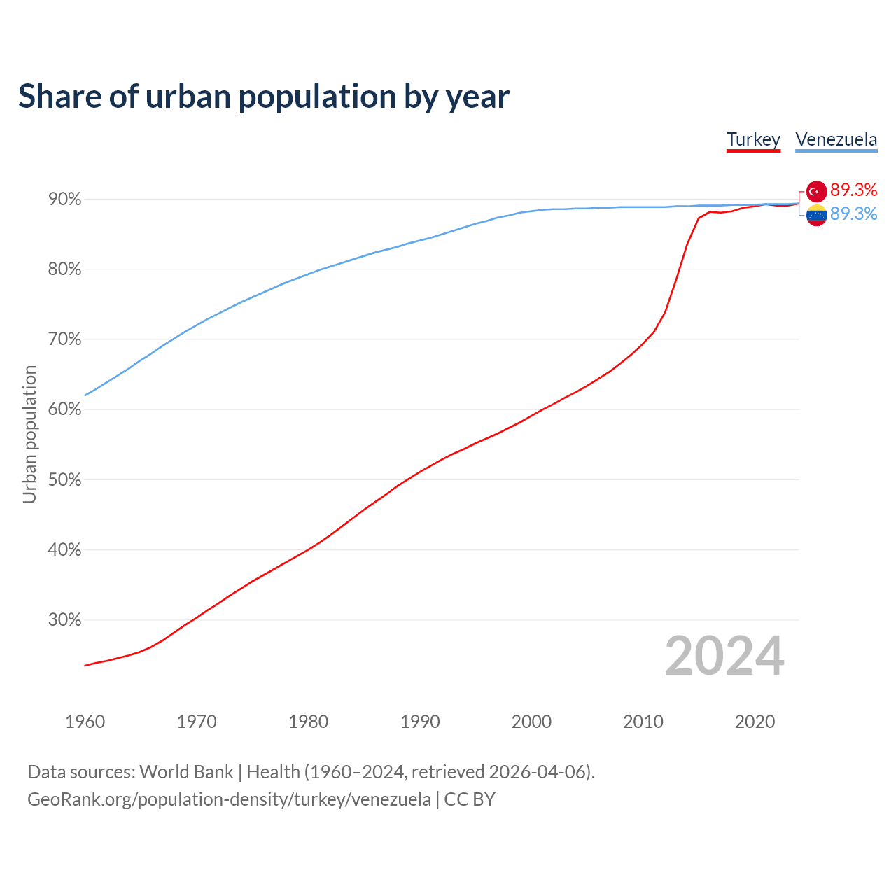 From 2004 to 2024, the share of urban population changed from 62.4% to 89.3% in Turkey and from 88.6% to 89.3% in Venezuela.