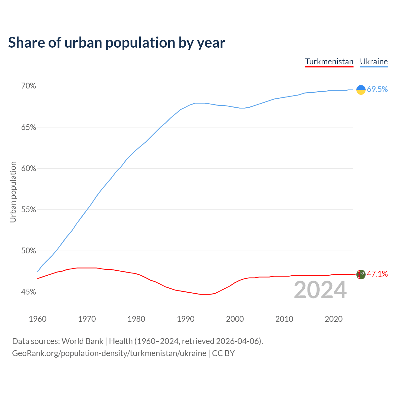 From 2006 to 2026, population density in Turkmenistan increased by 50.5%, compared to a 15.1% decline in Ukraine.