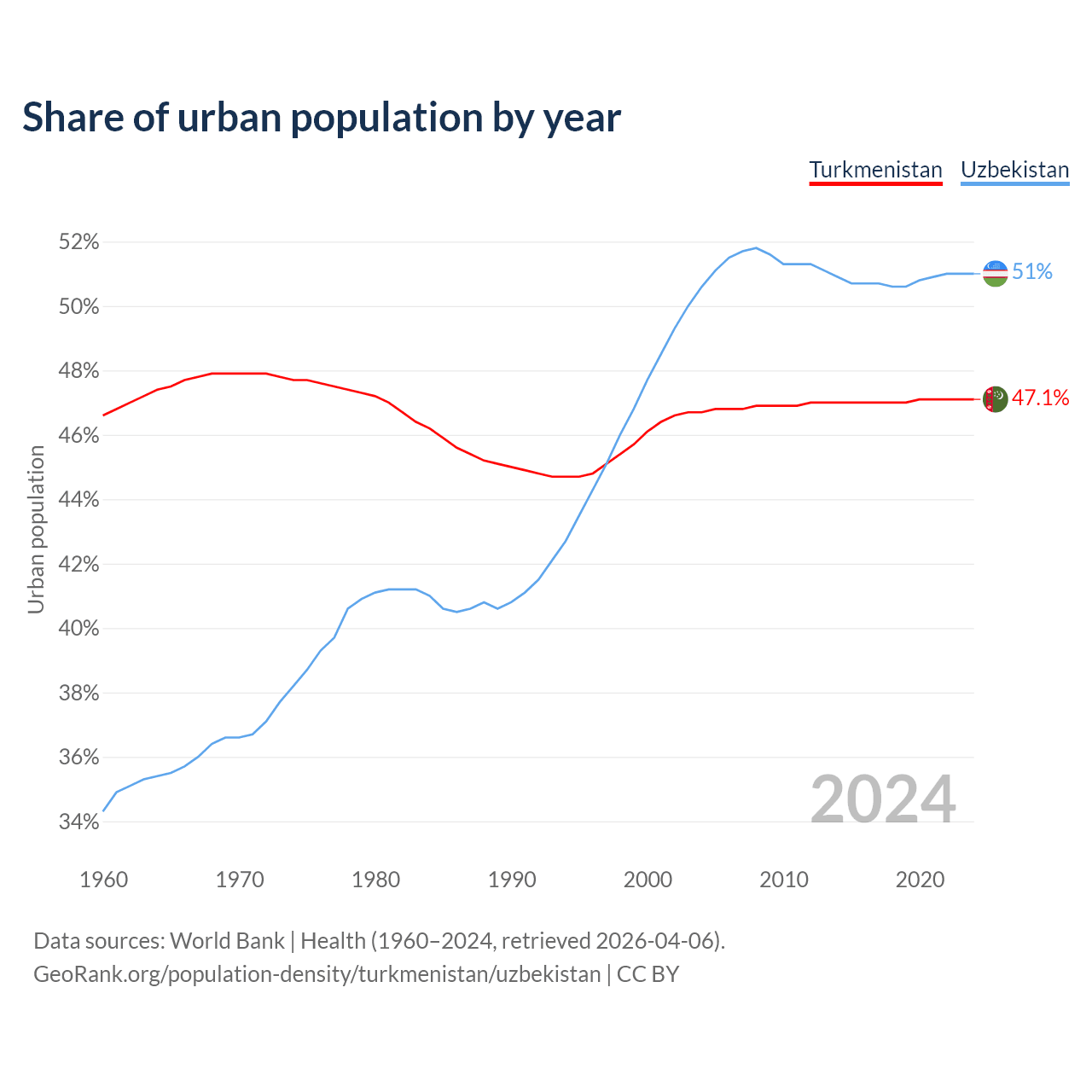 From 2004 to 2024, the share of urban population changed from 46.7% to 47.1% in Turkmenistan and from 50.6% to 51% in Uzbekistan.