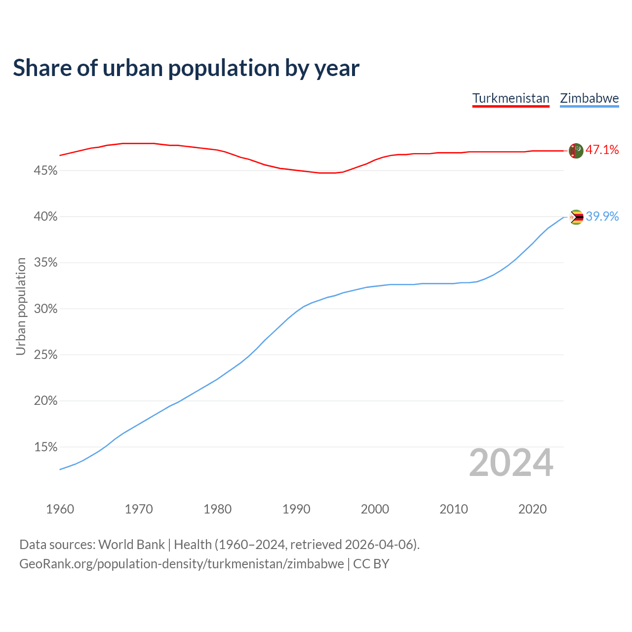 From 2004 to 2024, the share of urban population changed from 46.7% to 47.1% in Turkmenistan and from 32.6% to 39.9% in Zimbabwe.