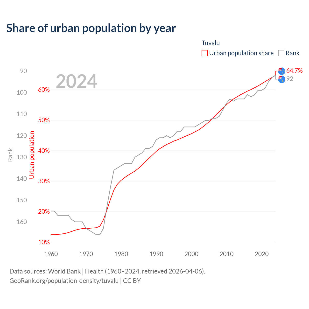 This chart shows the share of urban population in Tuvalu from 1960 to 2024: 12.4% lived in urban areas in 1960, 45.5% in 2000, and 64.7% in 2024.