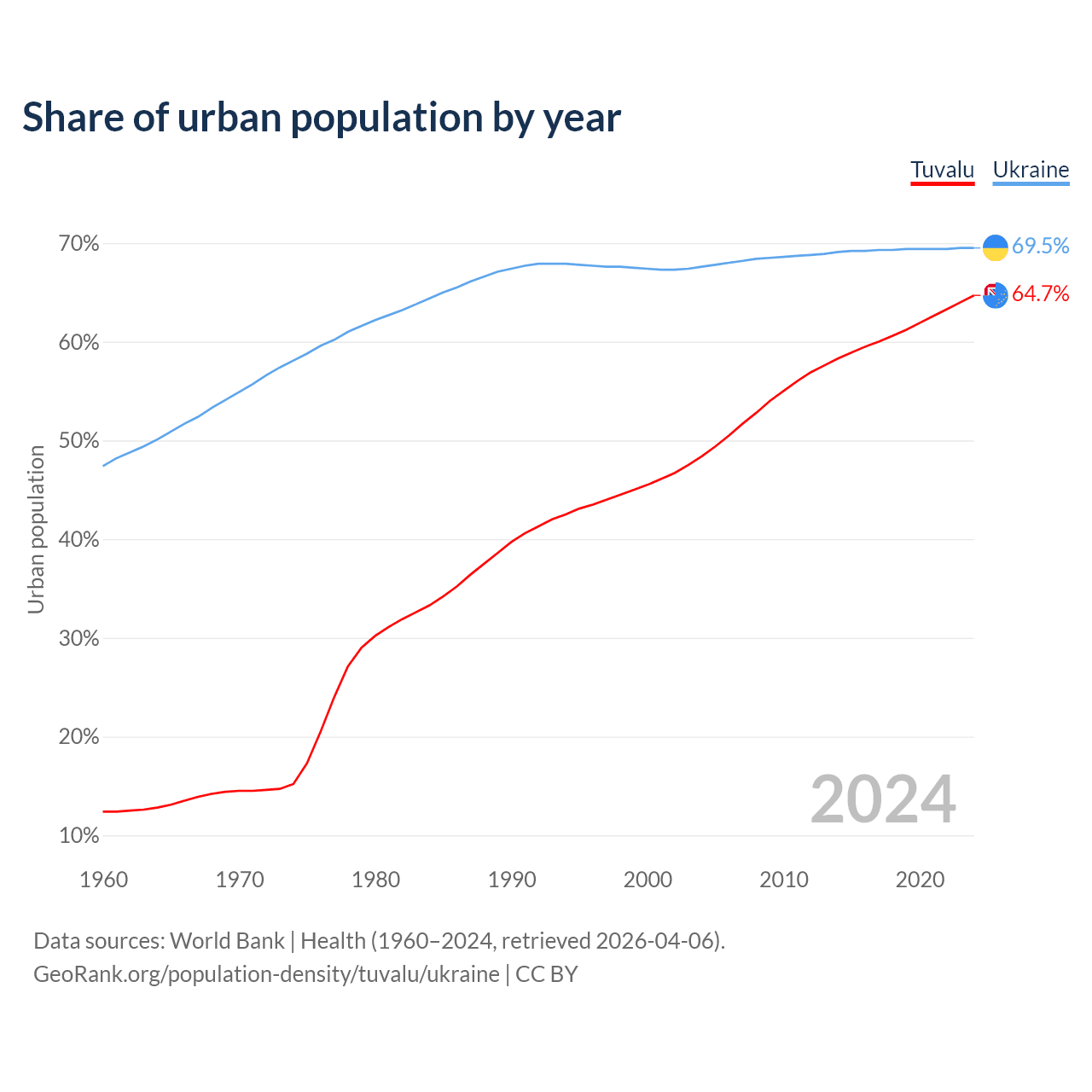 From 2004 to 2024, the share of urban population changed from 48.4% to 64.7% in Tuvalu and from 67.6% to 69.5% in Ukraine.