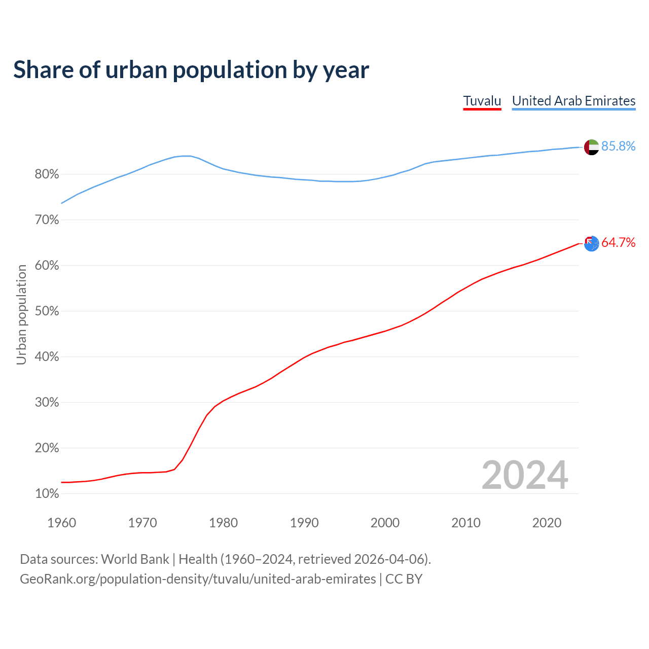 From 2004 to 2024, the share of urban population changed from 48.4% to 64.7% in Tuvalu and from 81.5% to 85.8% in the United Arab Emirates.
