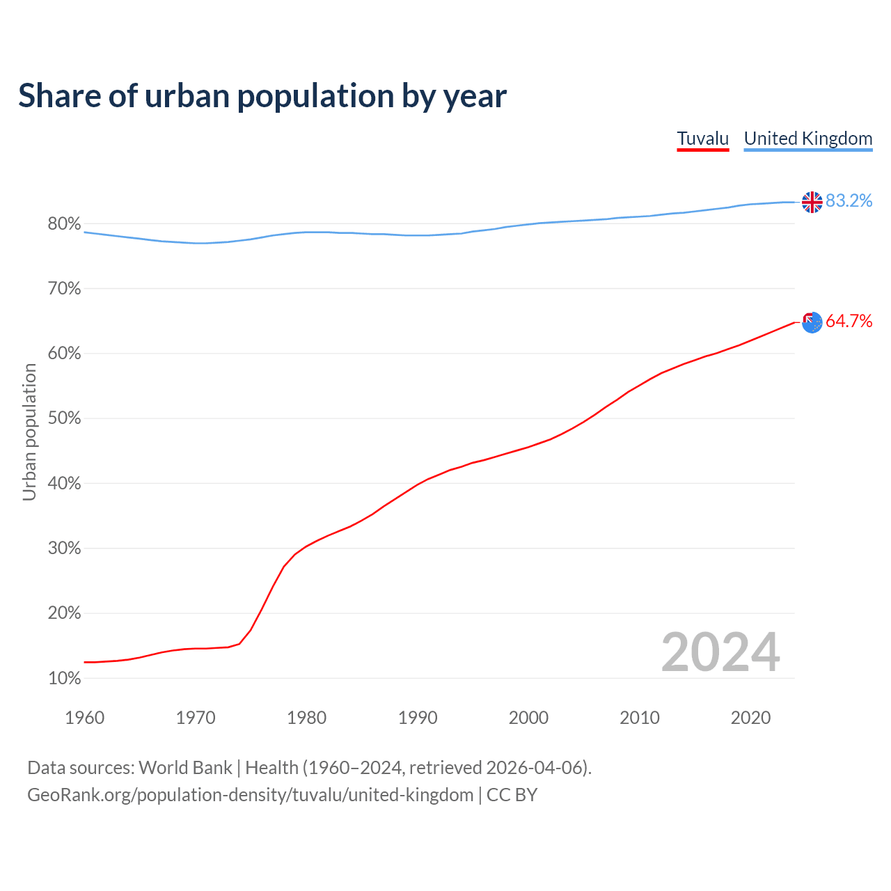 From 2004 to 2024, the share of urban population changed from 48.4% to 64.7% in Tuvalu and from 80.3% to 83.2% in the United Kingdom.