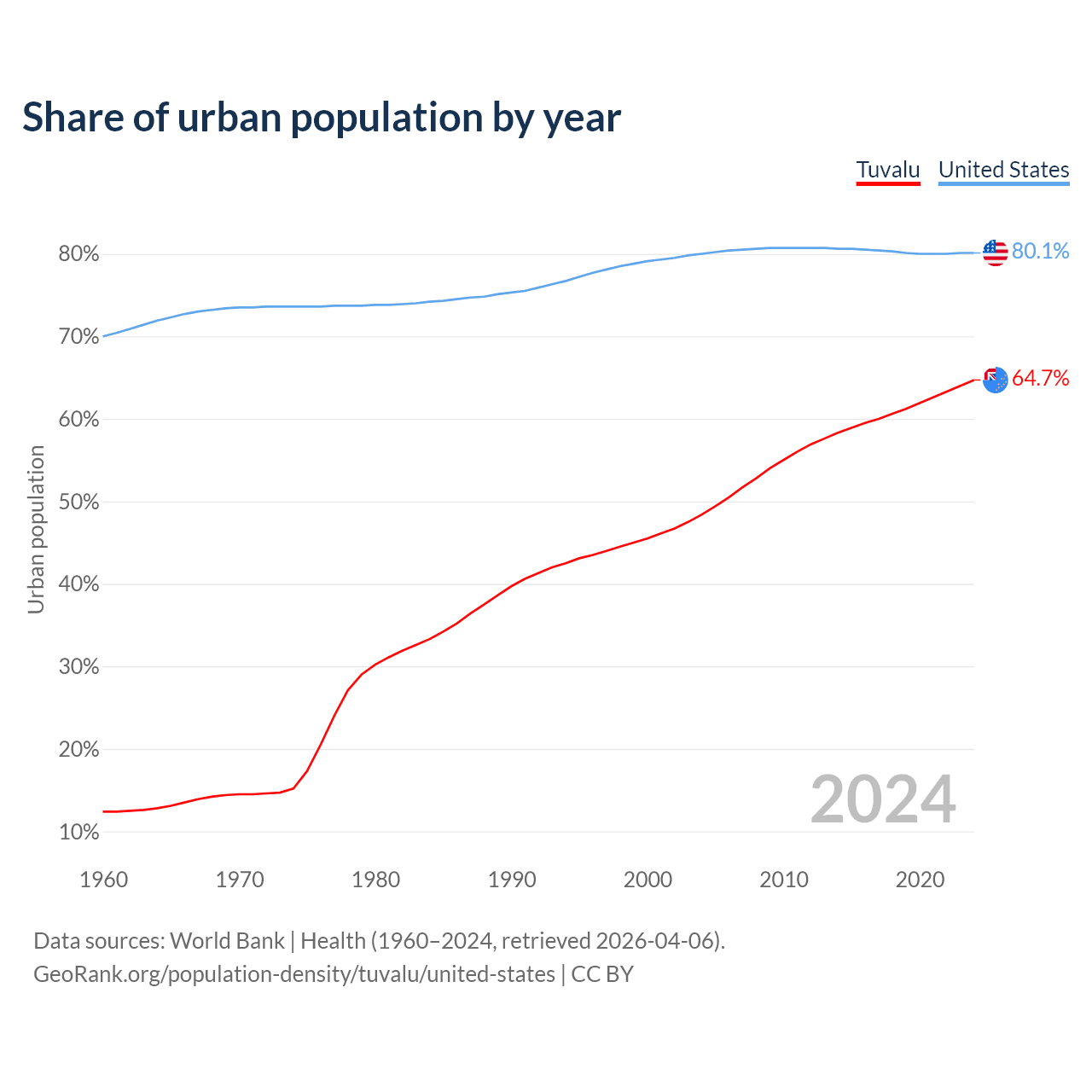From 2004 to 2024, the share of urban population changed from 48.4% to 64.7% in Tuvalu and from 80% to 80.1% in the United States.