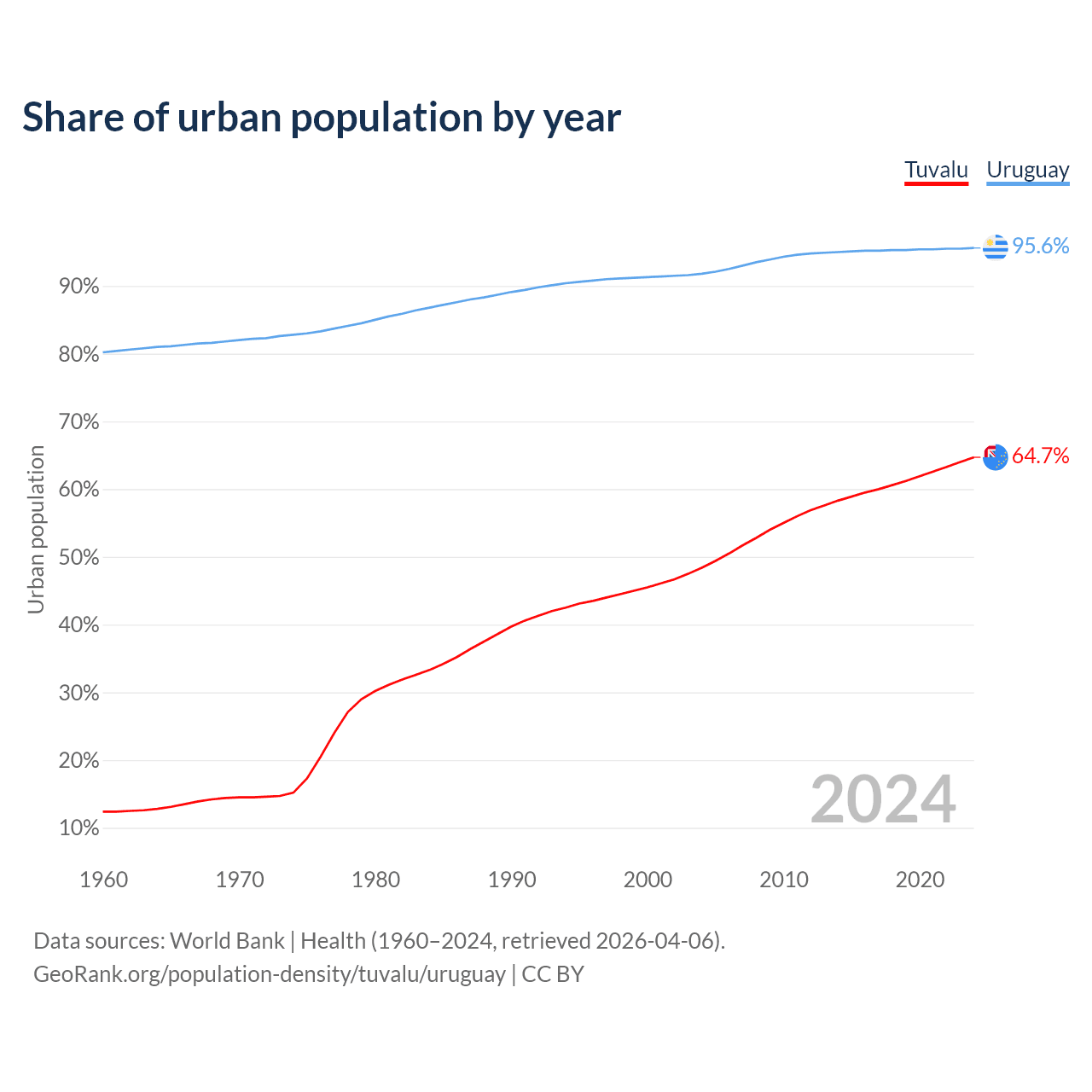 From 2004 to 2024, the share of urban population changed from 48.4% to 64.7% in Tuvalu and from 91.8% to 95.6% in Uruguay.
