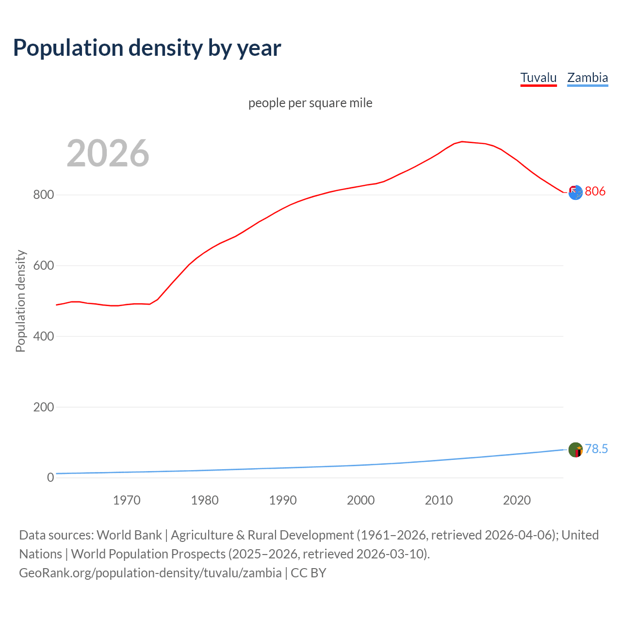 From 2006 to 2026, population density in Tuvalu decreased by 7.1%, compared to a 85.7% growth in Zambia.