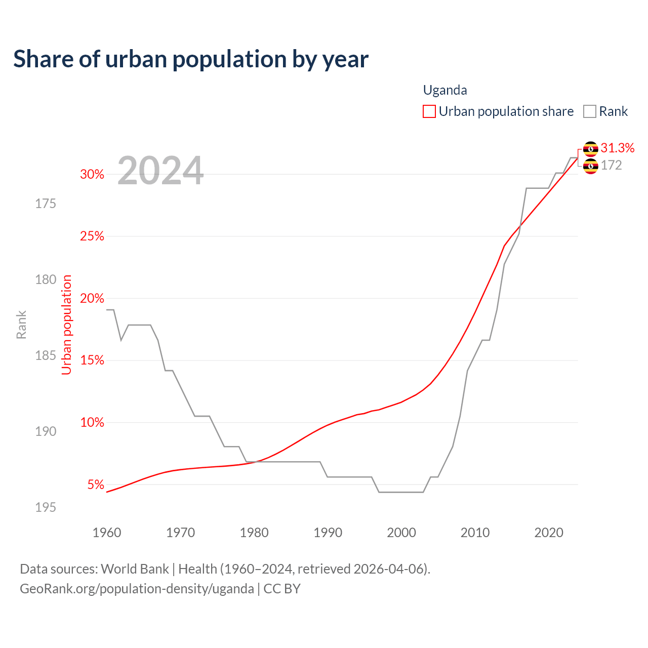 This chart shows the share of urban population in Uganda from 1960 to 2024: 4.36% lived in urban areas in 1960, 11.6% in 2000, and 31.3% in 2024.
