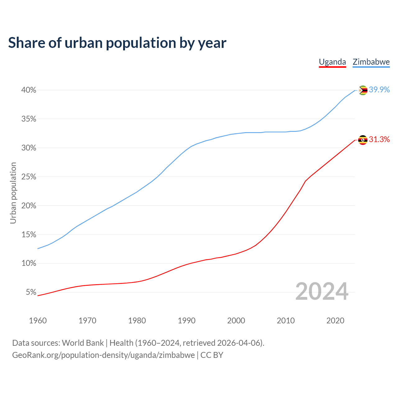 From 2004 to 2024, the share of urban population changed from 13.1% to 31.3% in Uganda and from 32.6% to 39.9% in Zimbabwe.