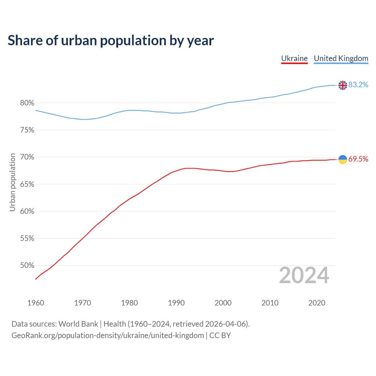 From 2004 to 2024, the share of urban population changed from 67.6% to 69.5% in Ukraine and from 80.3% to 83.2% in the United Kingdom.
