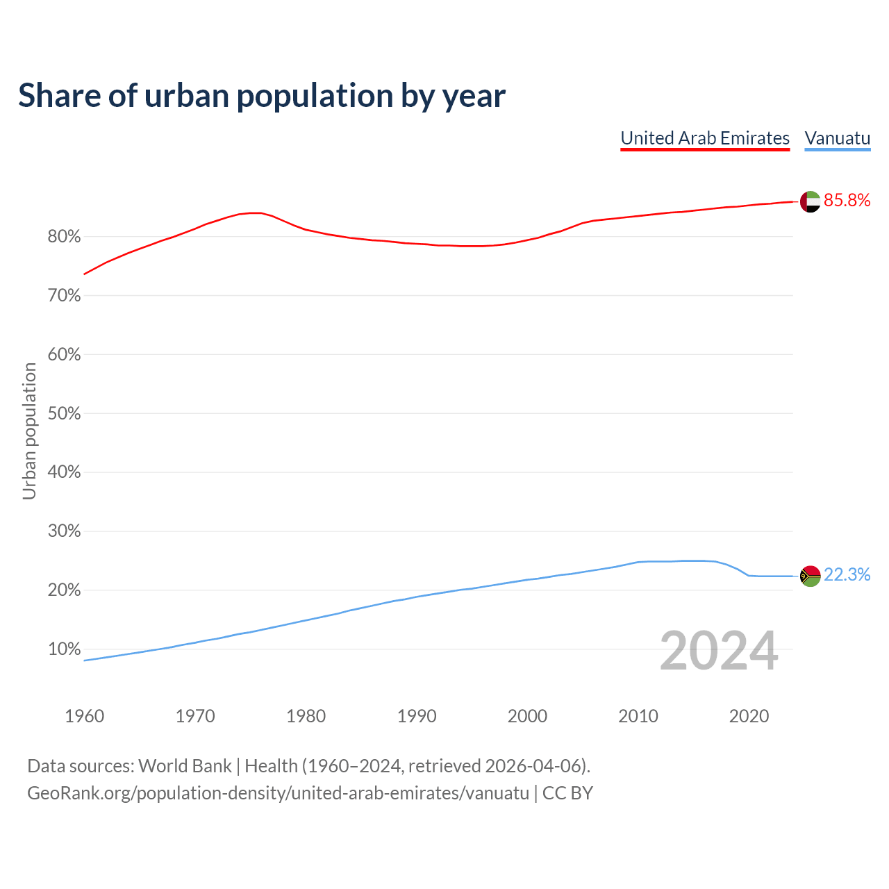 From 2004 to 2024, the share of urban population changed from 81.5% to 85.8% in the United Arab Emirates and from 22.7% to 22.3% in Vanuatu.