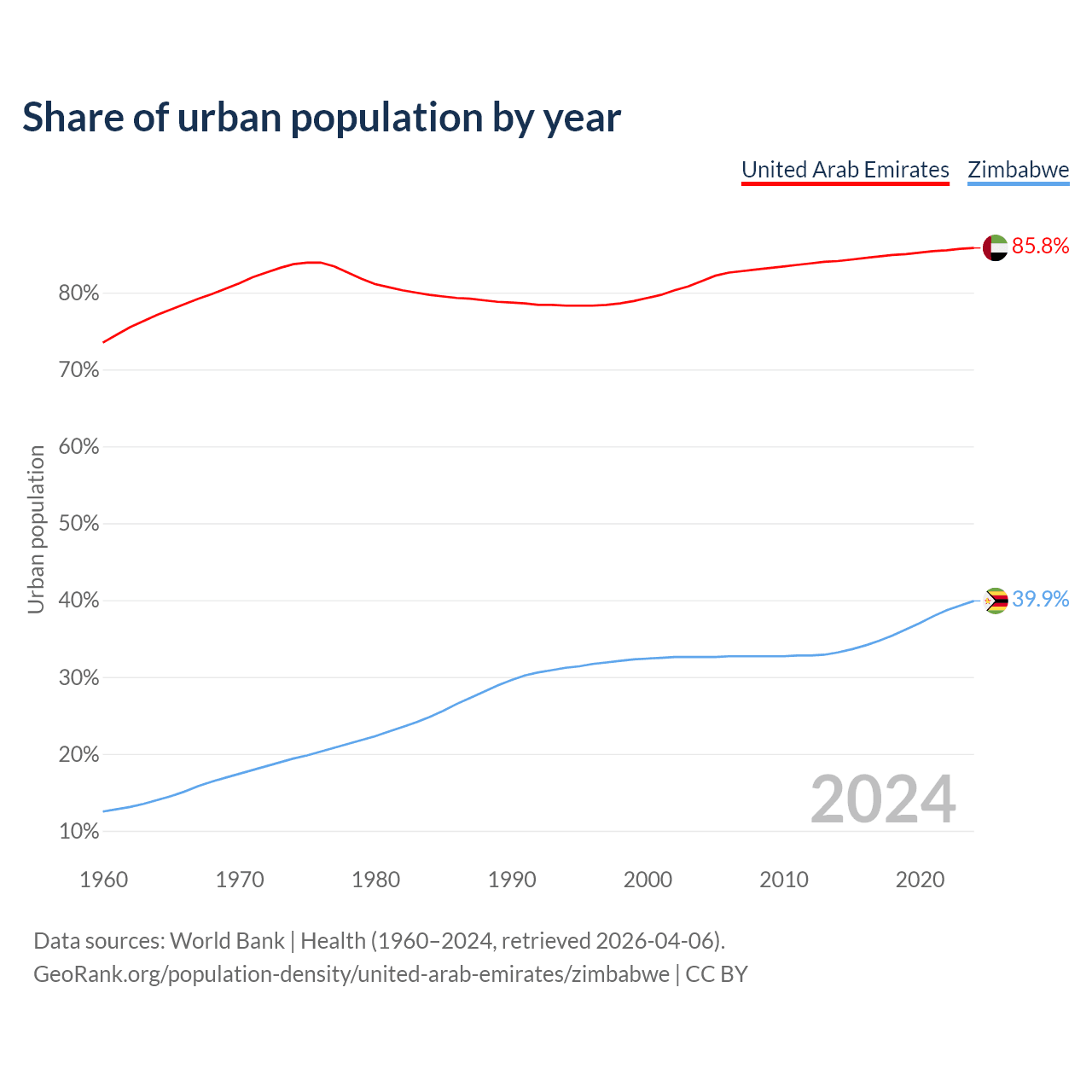 From 2004 to 2024, the share of urban population changed from 81.5% to 85.8% in the United Arab Emirates and from 32.6% to 39.9% in Zimbabwe.