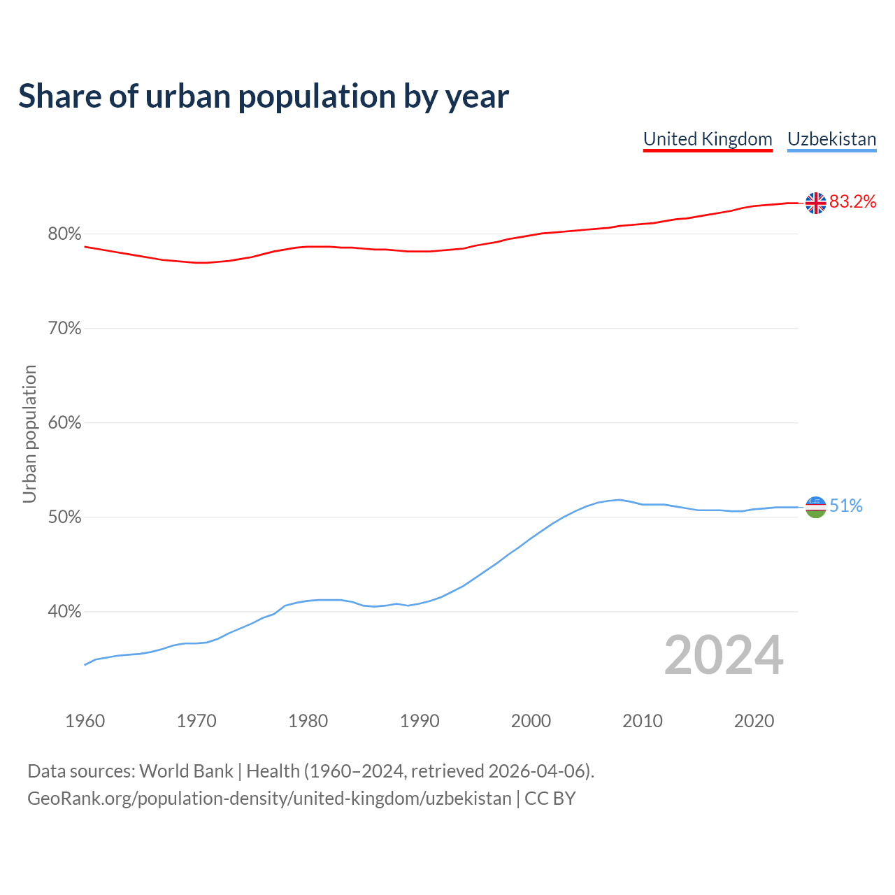 From 2004 to 2024, the share of urban population changed from 80.3% to 83.2% in the United Kingdom and from 50.6% to 51% in Uzbekistan.