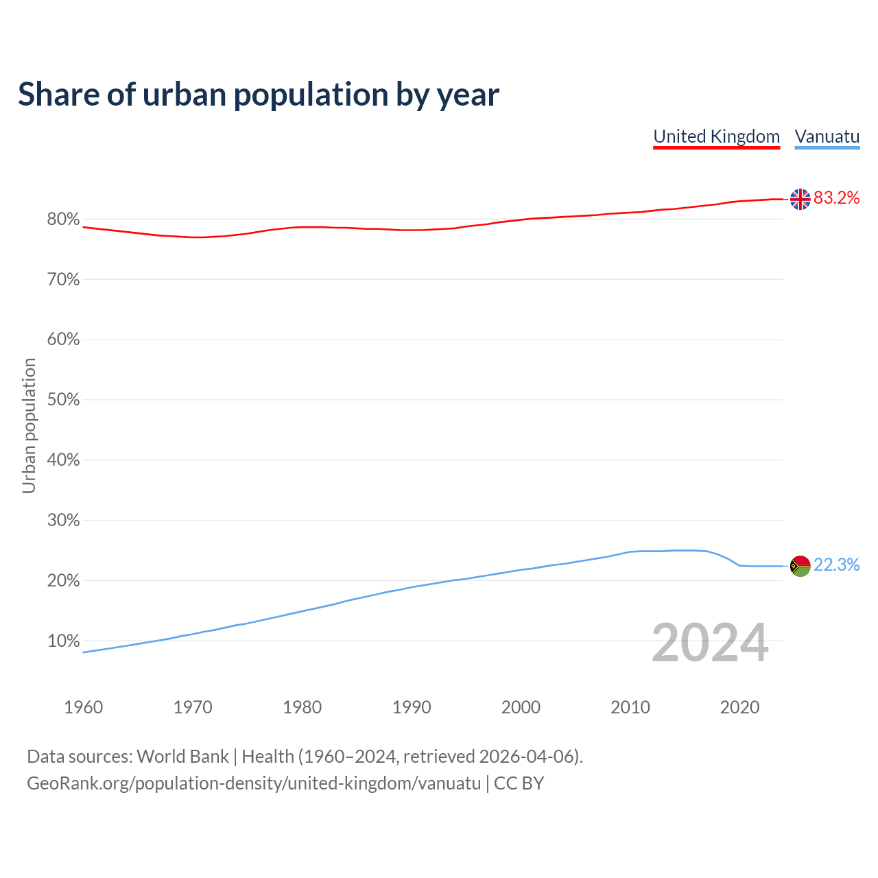 From 2004 to 2024, the share of urban population changed from 80.3% to 83.2% in the United Kingdom and from 22.7% to 22.3% in Vanuatu.