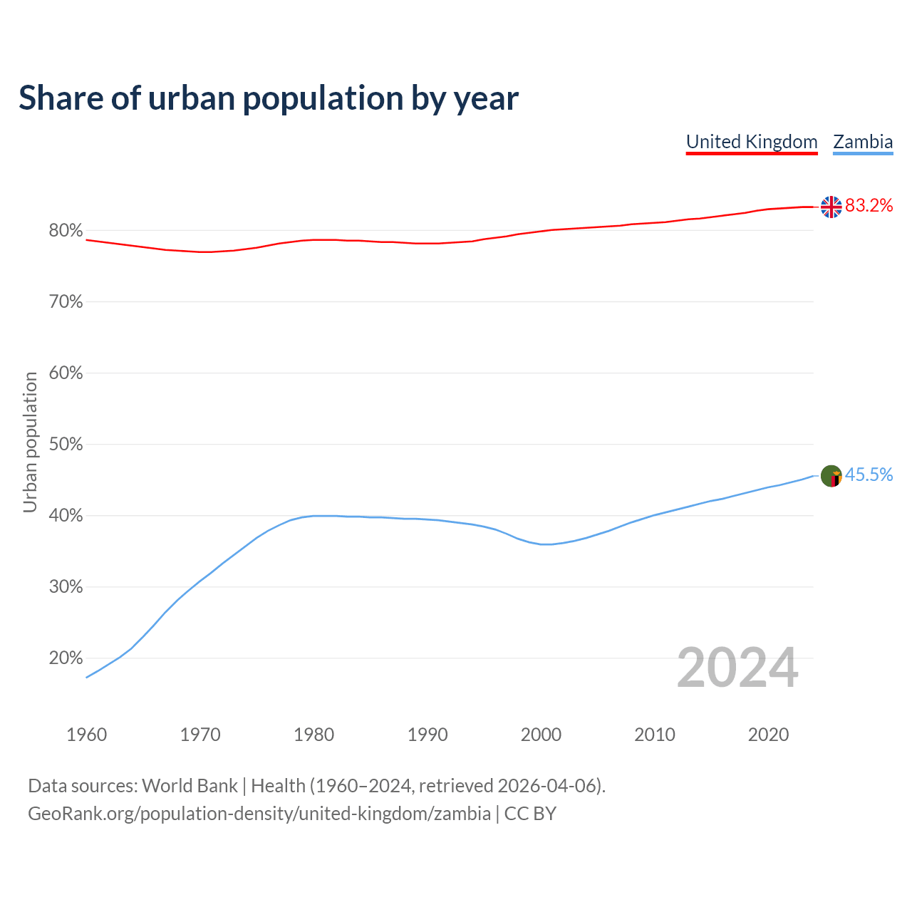 From 2004 to 2024, the share of urban population changed from 80.3% to 83.2% in the United Kingdom and from 36.8% to 45.5% in Zambia.