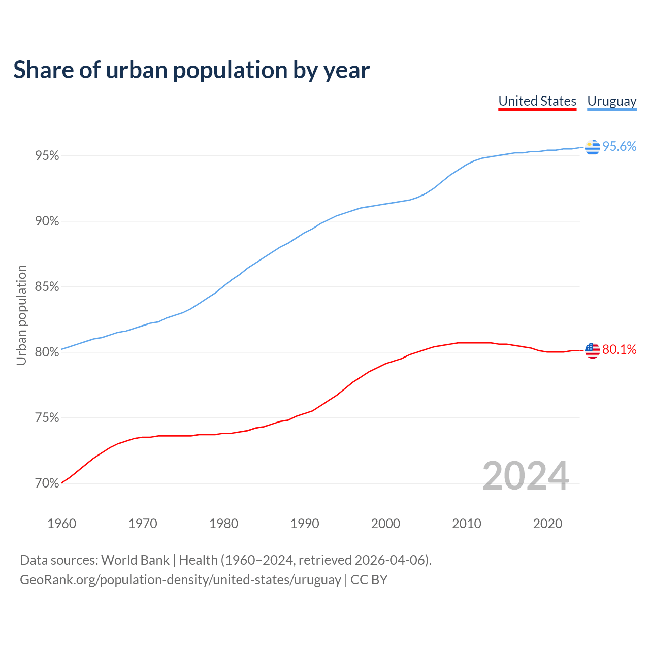 From 2004 to 2024, the share of urban population changed from 80% to 80.1% in the United States and from 91.8% to 95.6% in Uruguay.