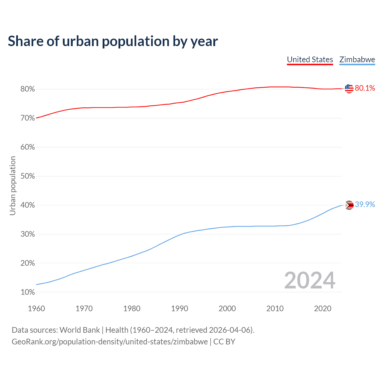 From 2004 to 2024, the share of urban population changed from 80% to 80.1% in the United States and from 32.6% to 39.9% in Zimbabwe.