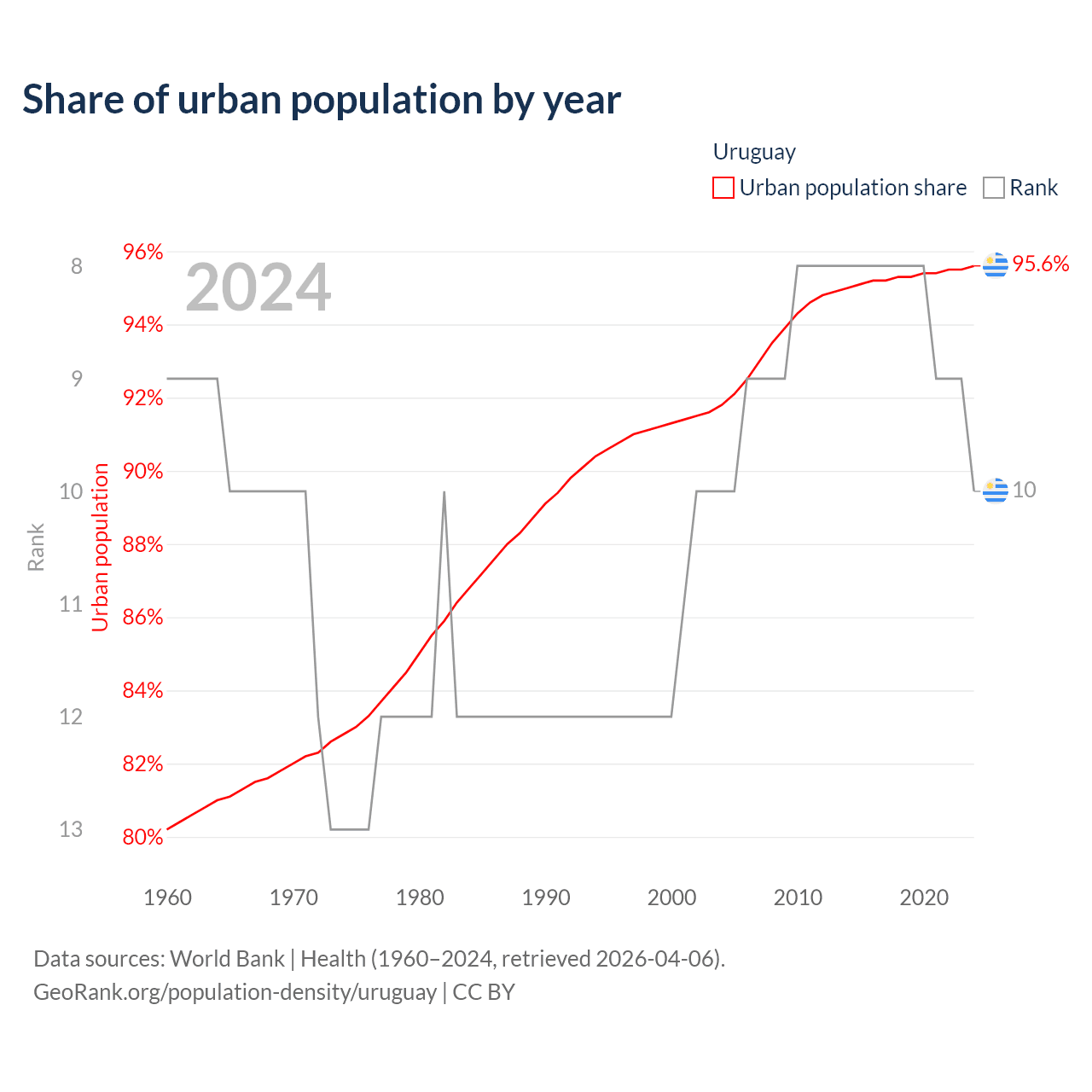 This chart shows the share of urban population in Uruguay from 1960 to 2024: 80.2% lived in urban areas in 1960, 91.3% in 2000, and 95.6% in 2024.