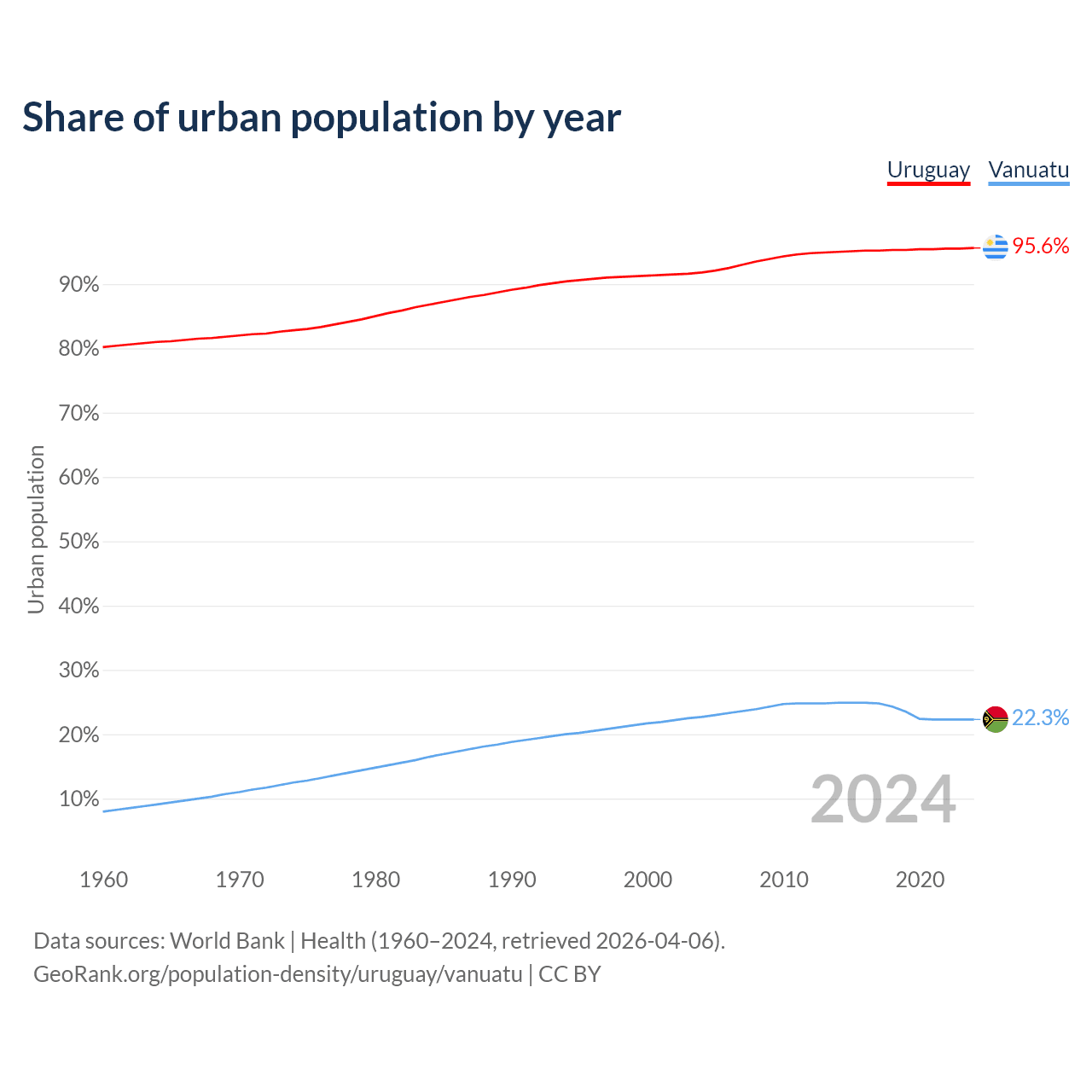 From 2004 to 2024, the share of urban population changed from 91.8% to 95.6% in Uruguay and from 22.7% to 22.3% in Vanuatu.