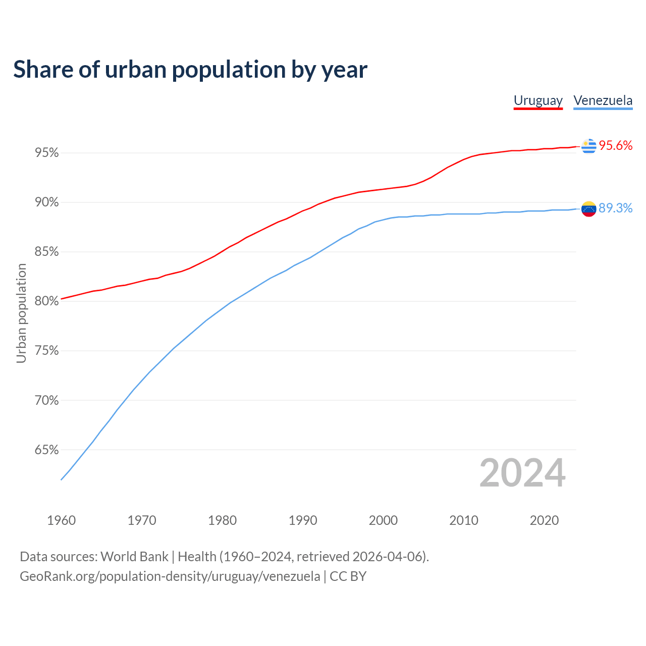 From 2004 to 2024, the share of urban population changed from 91.8% to 95.6% in Uruguay and from 88.6% to 89.3% in Venezuela.