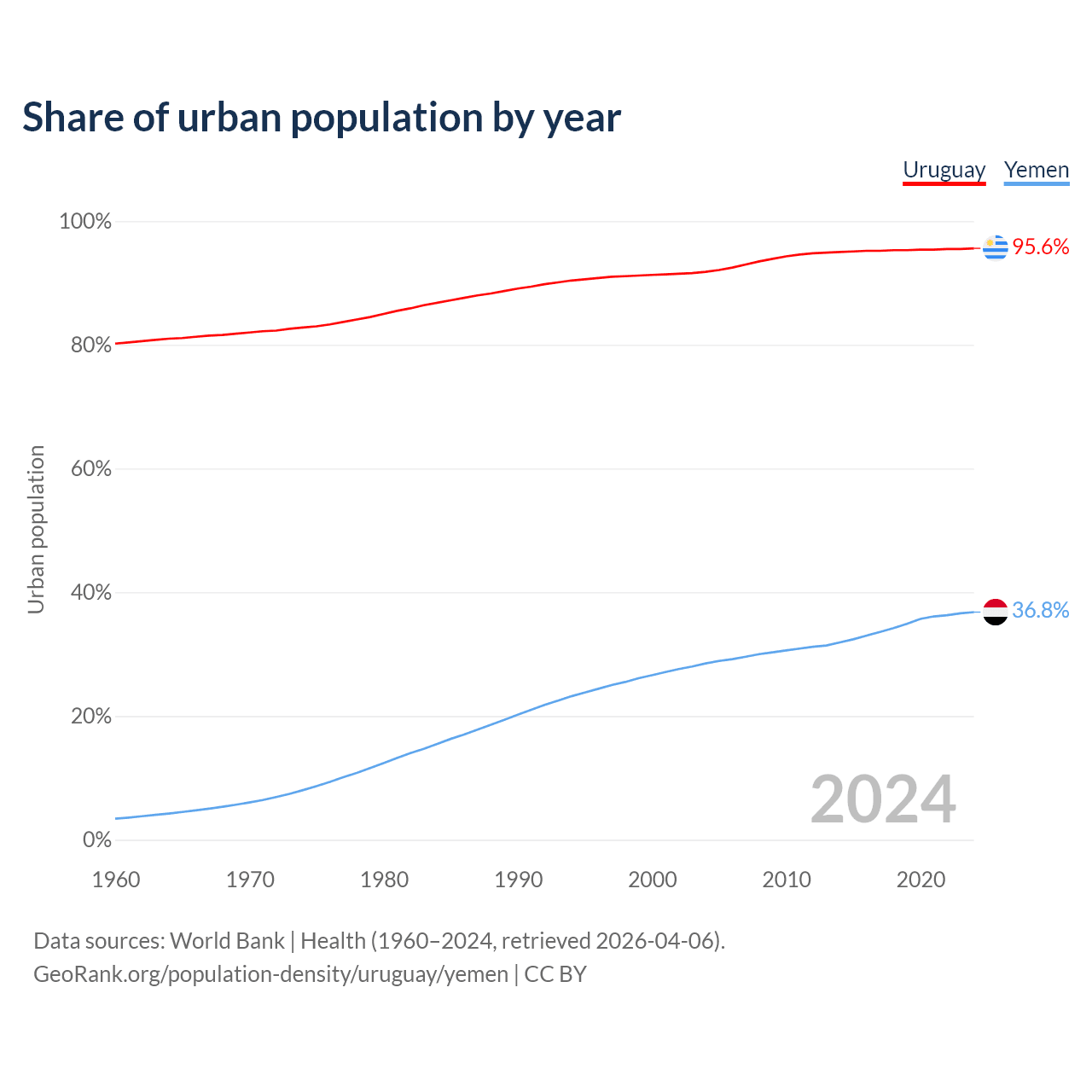 From 2004 to 2024, the share of urban population changed from 91.8% to 95.6% in Uruguay and from 28.5% to 36.8% in Yemen.