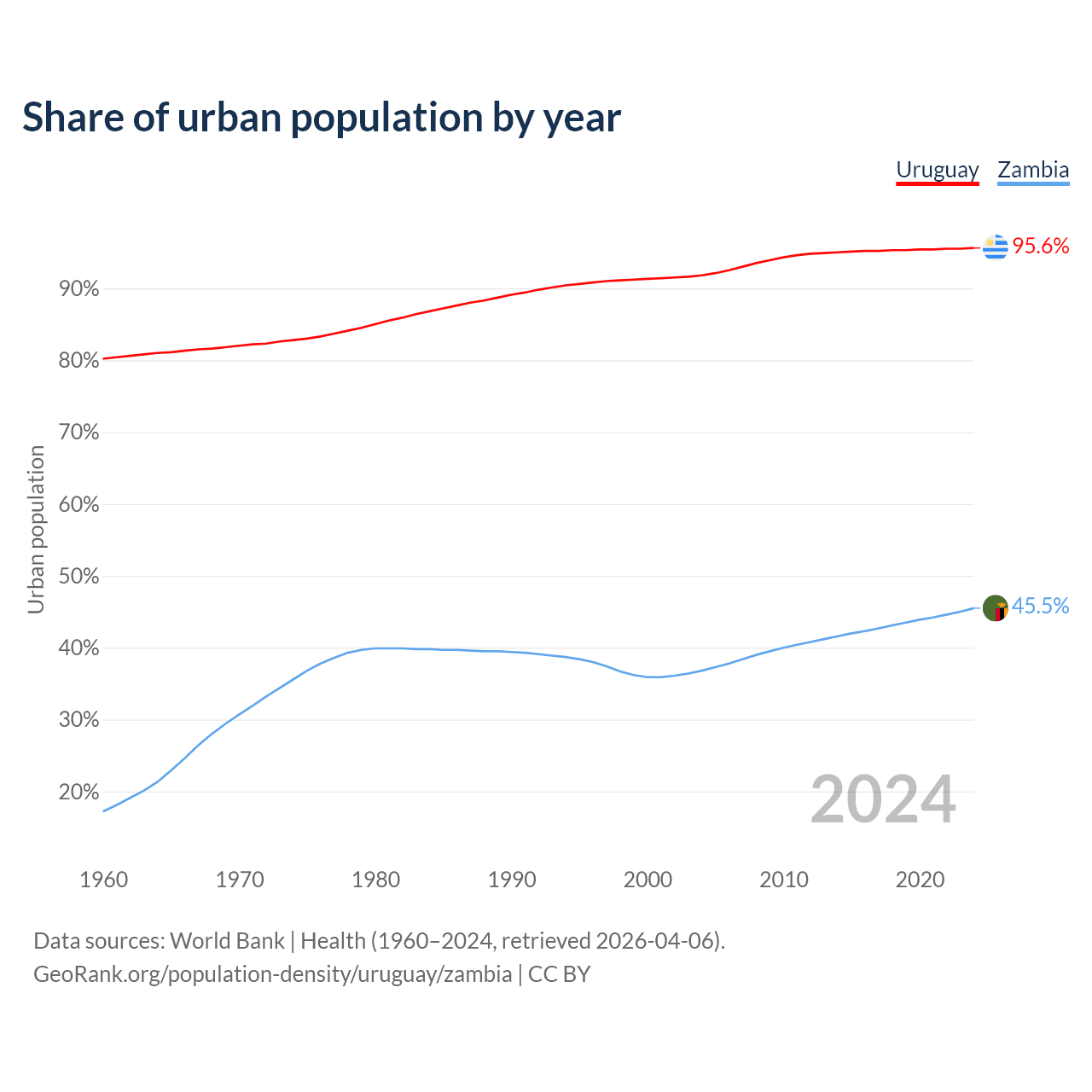 From 2004 to 2024, the share of urban population changed from 91.8% to 95.6% in Uruguay and from 36.8% to 45.5% in Zambia.