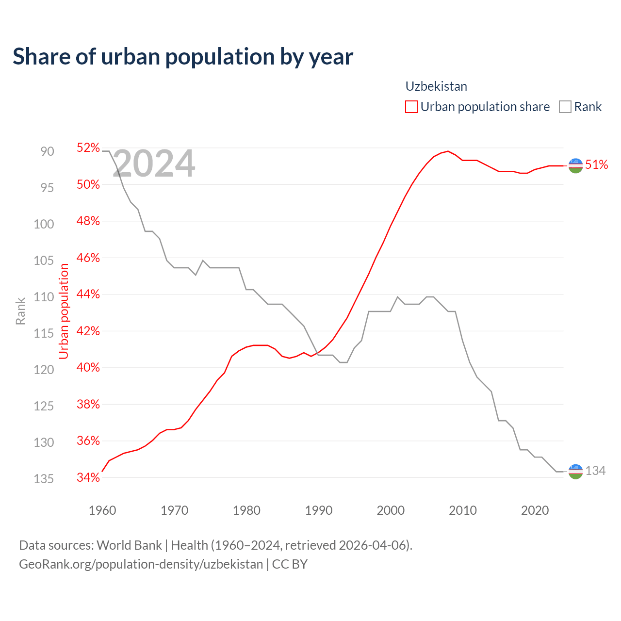 This chart shows the share of urban population in Uzbekistan from 1960 to 2024: 34.3% lived in urban areas in 1960, 47.7% in 2000, and 51% in 2024.