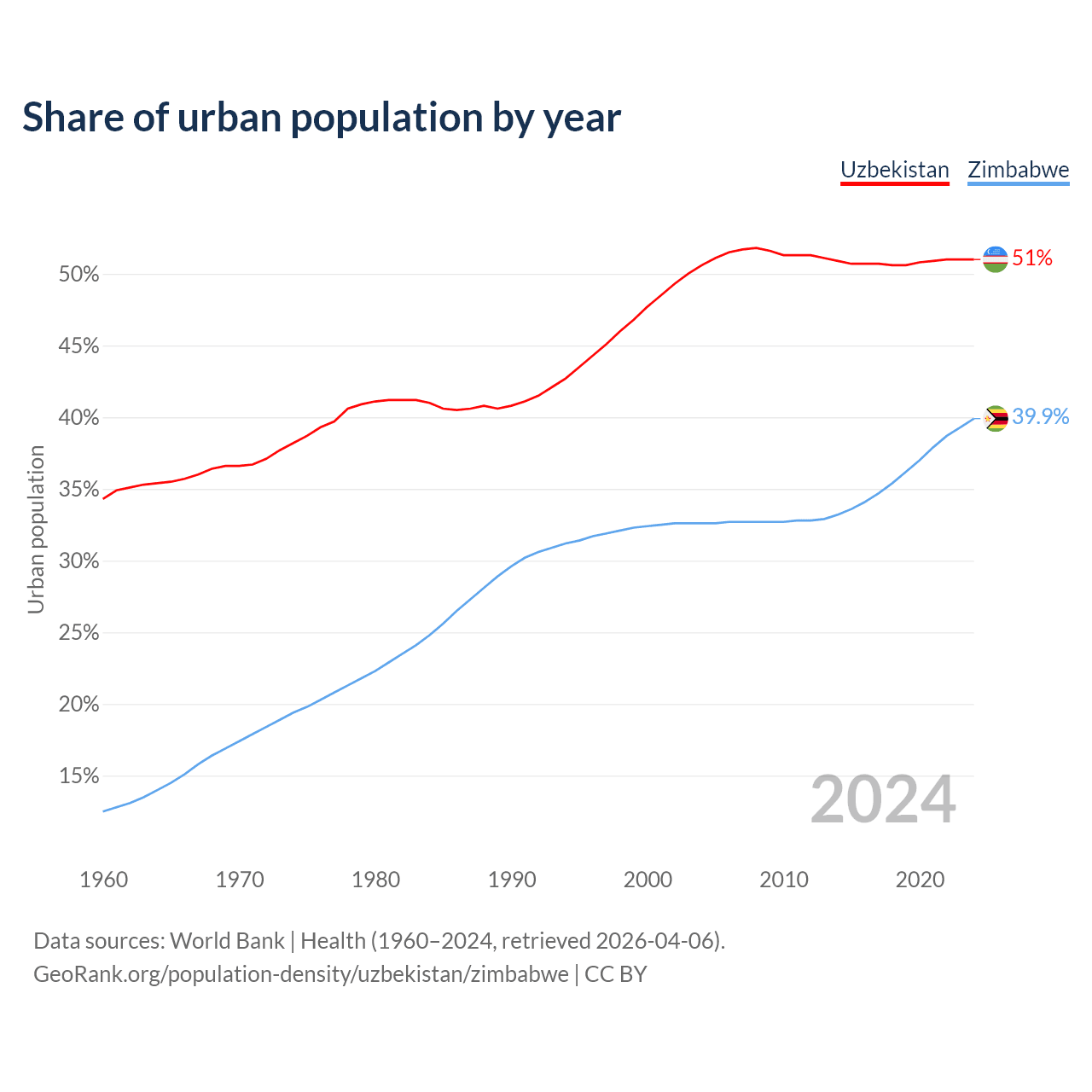 From 2004 to 2024, the share of urban population changed from 50.6% to 51% in Uzbekistan and from 32.6% to 39.9% in Zimbabwe.