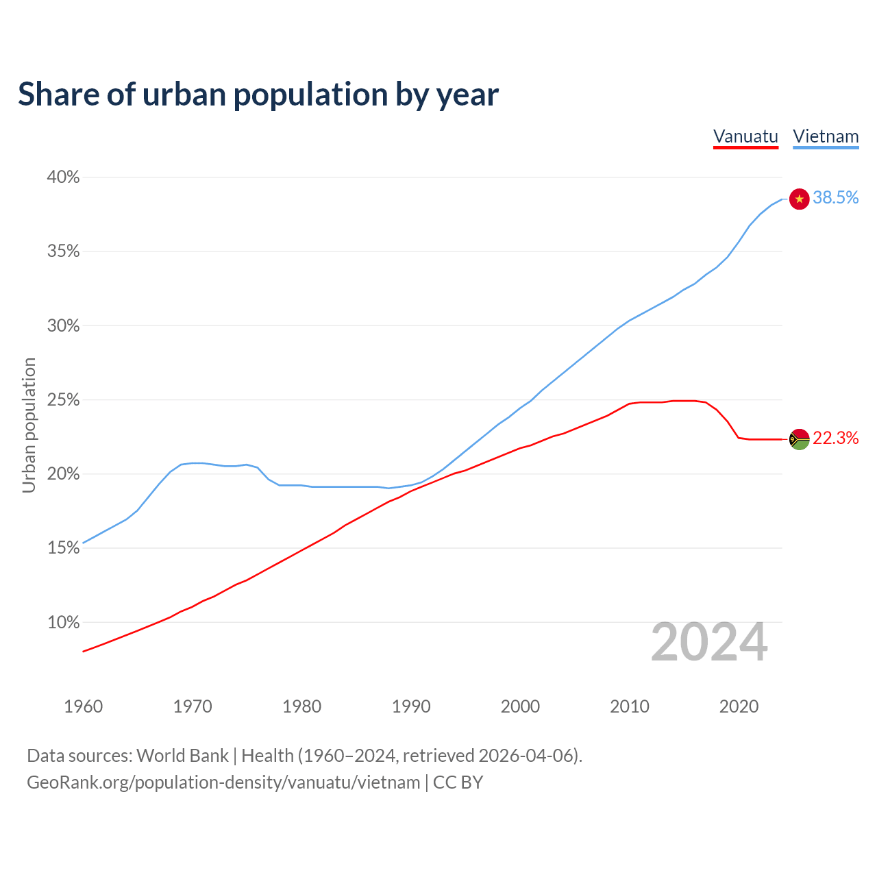 From 2006 to 2026, population density in Vanuatu increased by 58.7%, compared to a 24.1% growth in Vietnam.