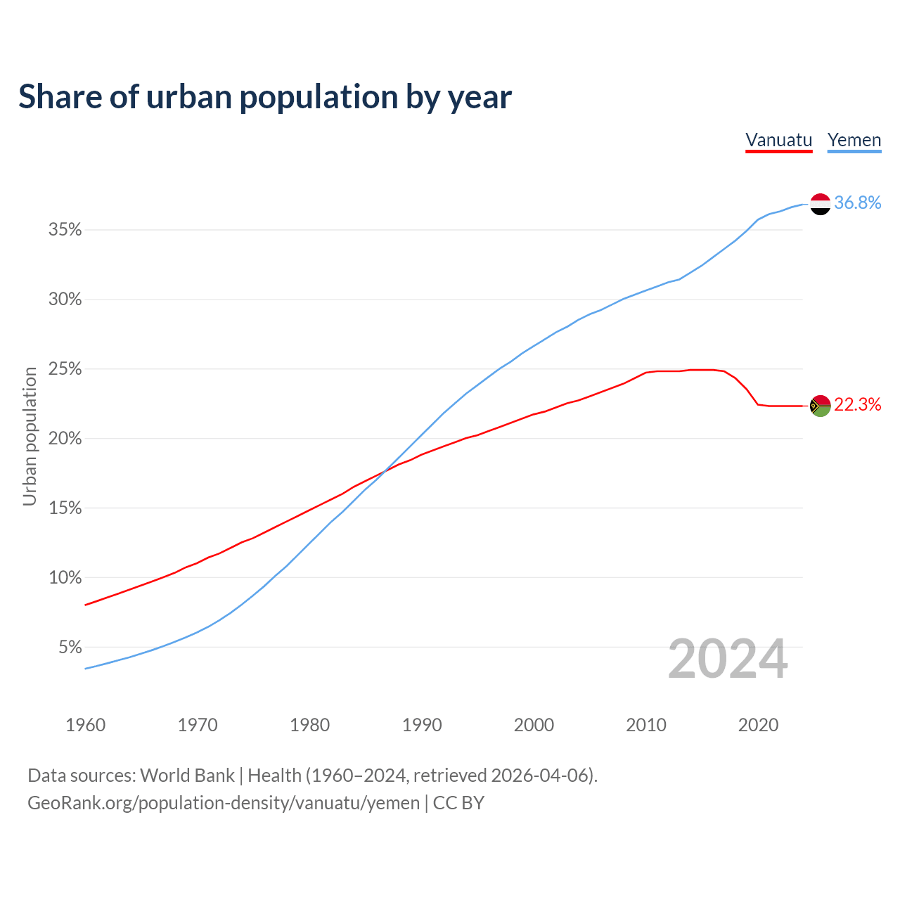 From 2004 to 2024, the share of urban population changed from 22.7% to 22.3% in Vanuatu and from 28.5% to 36.8% in Yemen.
