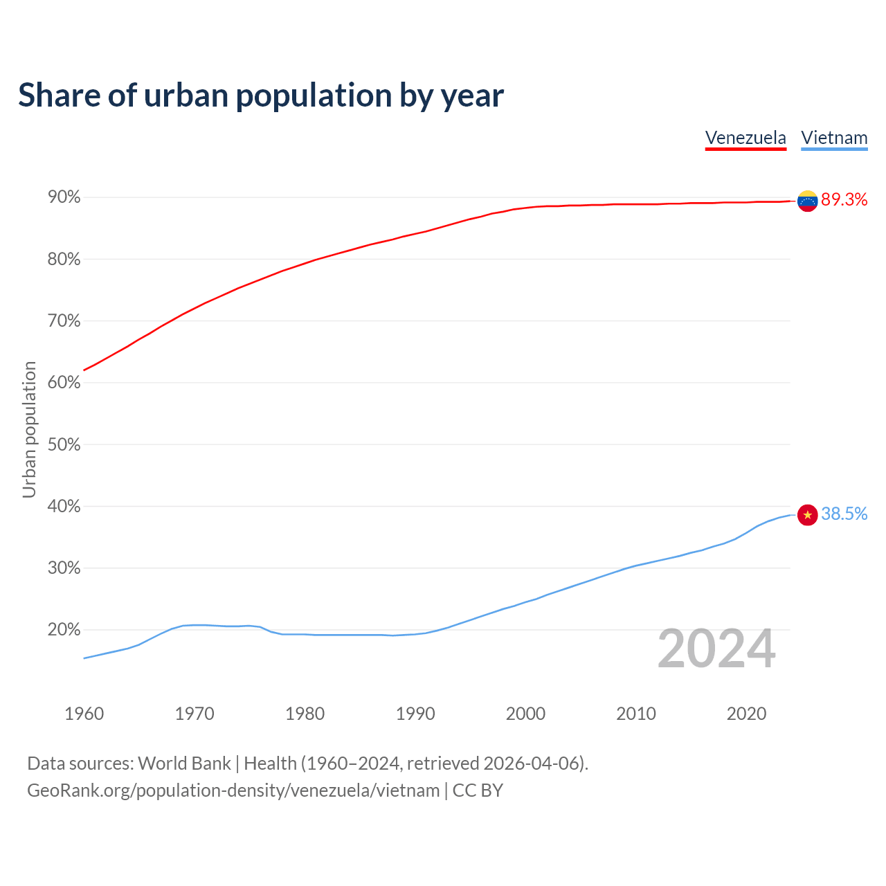 From 2004 to 2024, the share of urban population changed from 88.6% to 89.3% in Venezuela and from 26.8% to 38.5% in Vietnam.