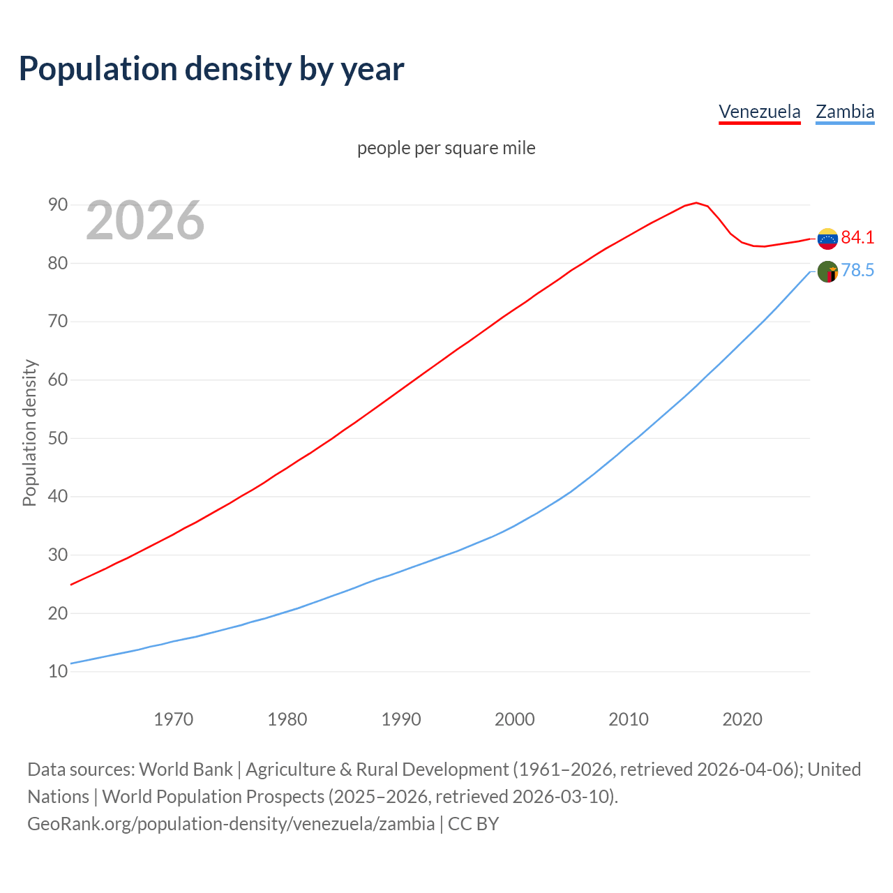 From 2006 to 2026, population density in Venezuela increased by 5.16%, compared to a 85.7% growth in Zambia.