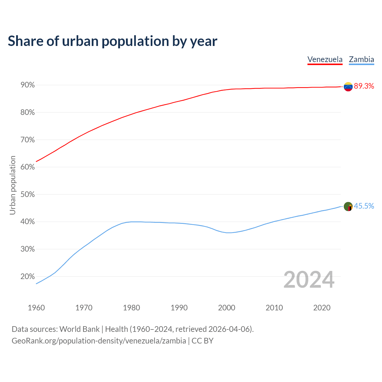 From 2004 to 2024, the share of urban population changed from 88.6% to 89.3% in Venezuela and from 36.8% to 45.5% in Zambia.