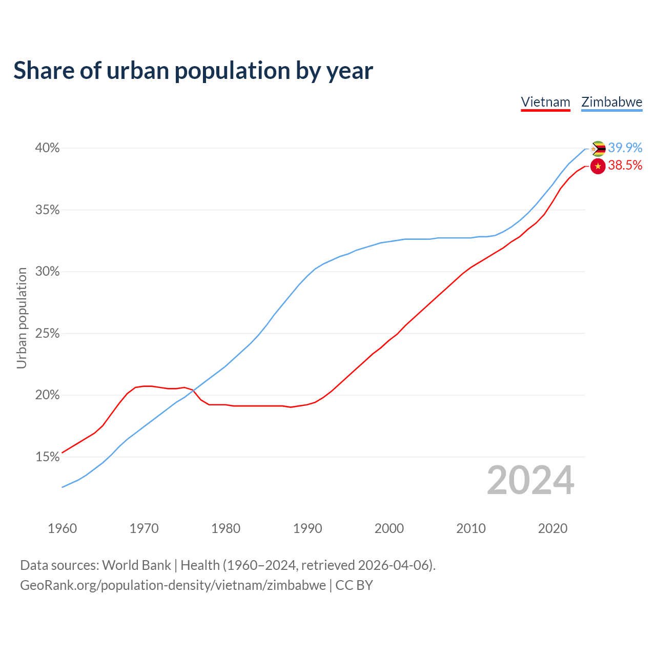 From 2004 to 2024, the share of urban population changed from 26.8% to 38.5% in Vietnam and from 32.6% to 39.9% in Zimbabwe.