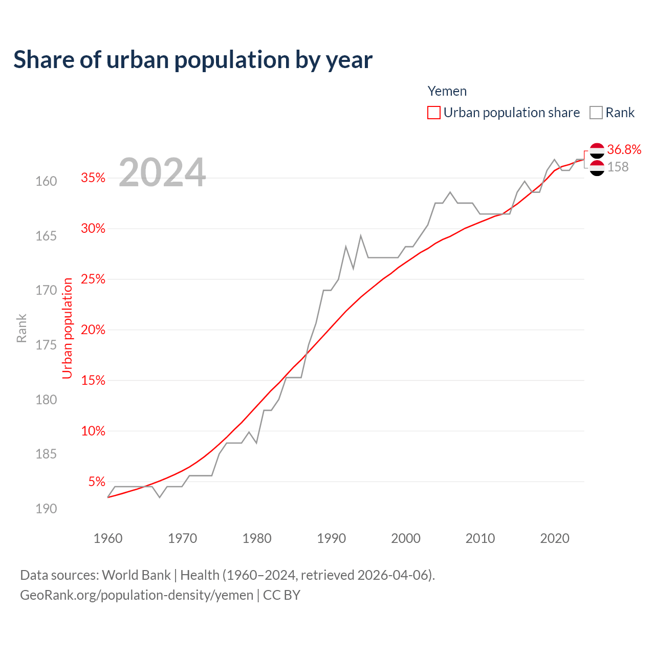 This chart shows the share of urban population in Yemen from 1960 to 2024: 3.4% lived in urban areas in 1960, 26.6% in 2000, and 36.8% in 2024.