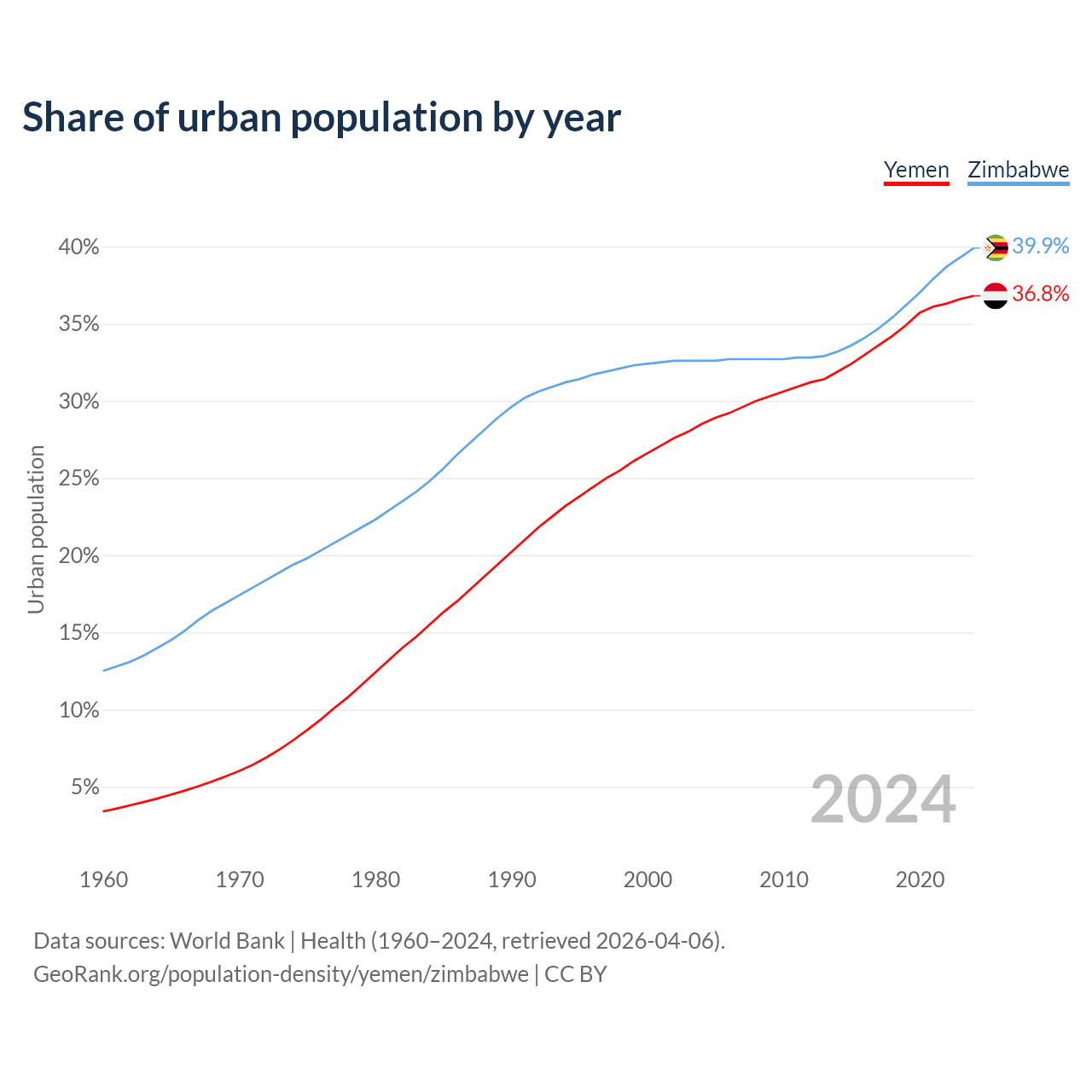 From 2004 to 2024, the share of urban population changed from 28.5% to 36.8% in Yemen and from 32.6% to 39.9% in Zimbabwe.