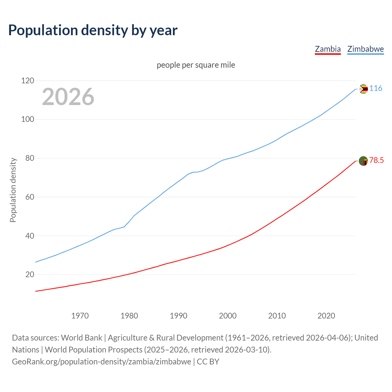 From 2006 to 2026, population density in Zambia increased by 85.7%, compared to a 36.7% growth in Zimbabwe.